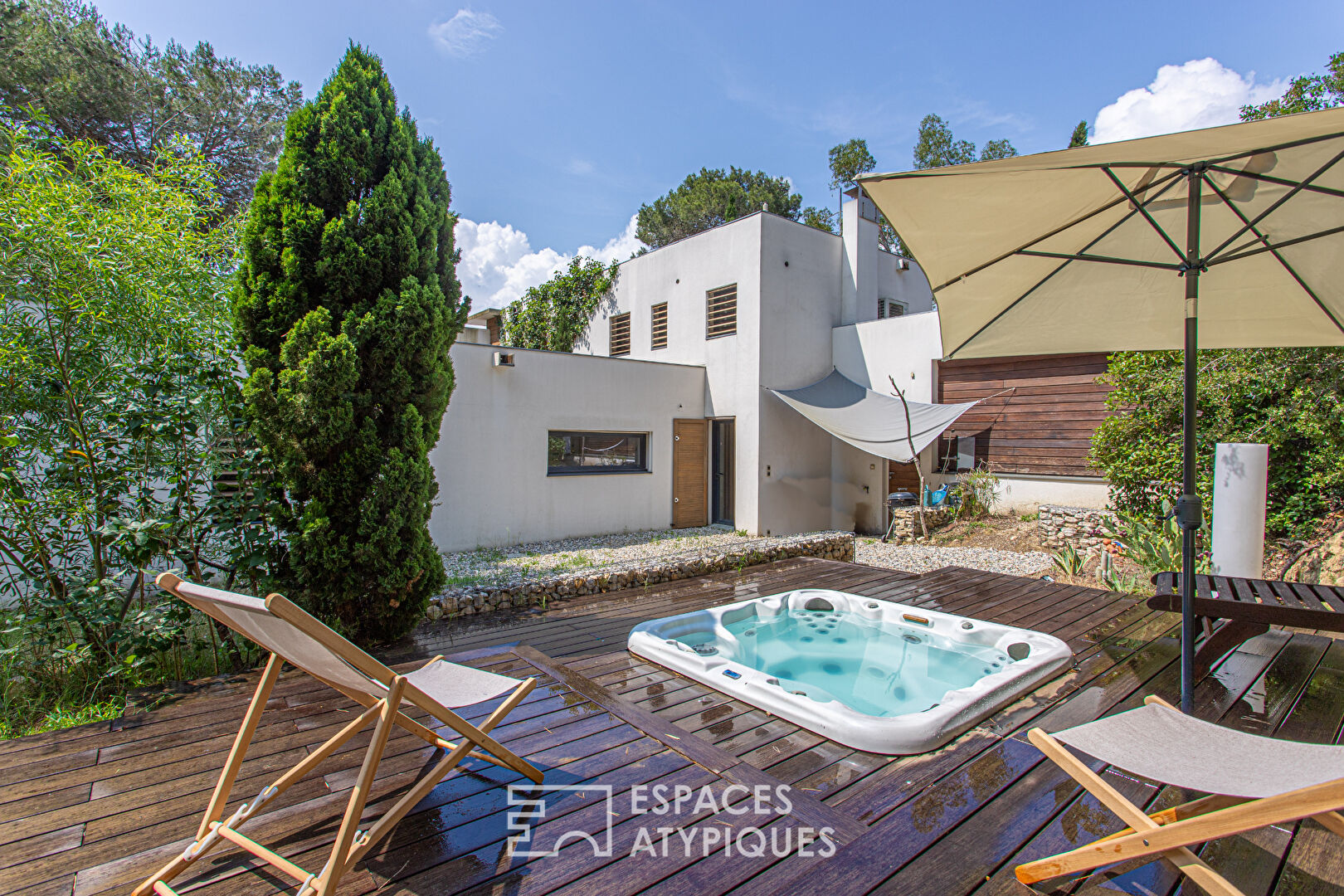On the heights of Villeneuve les Avignon, on the edge of a green area, the refined silhouette of this superb south-facing contemporary is emerging in a 2800m2 wooded garden.