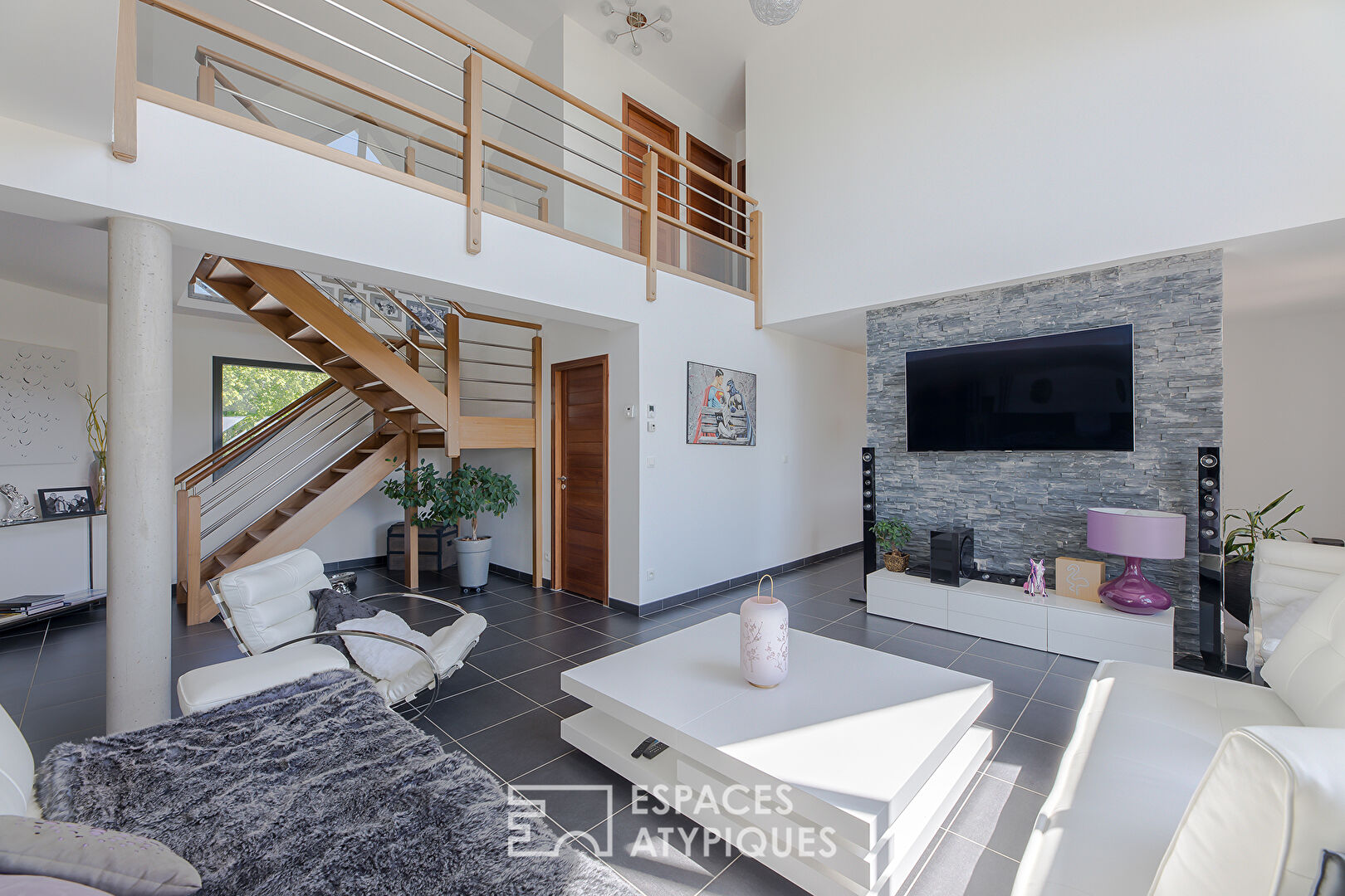 From the entrance, the gaze is on the heart of this house with an 85 sqm living room, open to a friendly space, bathed in light with large bay windows and magnified by its cathedral ceiling.