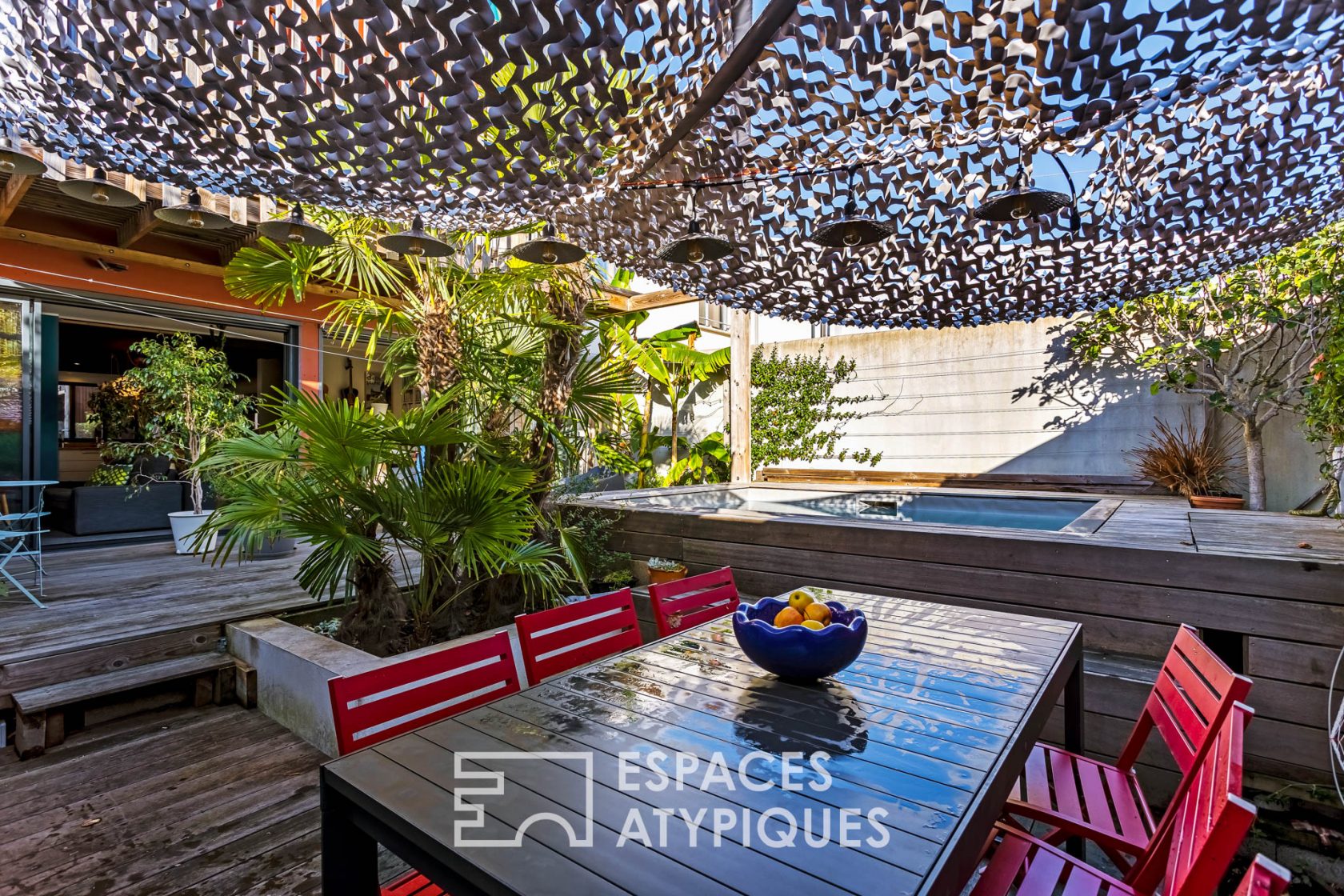L’espace extérieur luxuriant est organisé autour du bassin cubique, lové dans son écrin de bois.
