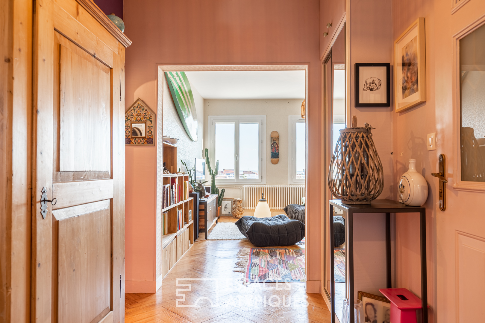 L’entrée chaleureuse donne le ton avec sa décoration « bobo » et une sélection affirmée de mobilier vintage. Les éléments d’origine tel les parquets anciens et la cheminée soulignent les volumes et la hauteur sous plafond confortable de 2,80 m. La pièce de réception, exposée Sud, profite d’une sélection des matières et des couleurs rendant le lieu chaleureux. Les menuiseries en double vitrage offrent un spectacle avec l’enchevêtrement des toitures, des jardins, la vue sur la Cathédrale et l’aperçu sur la mer, un véritable spectacle vivant au fil des saisons.