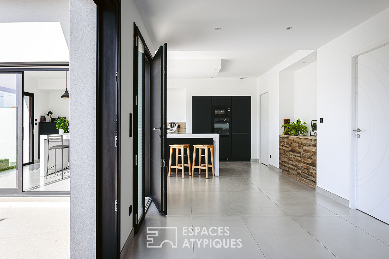A l’arrière, un espace cellier-buanderie facilite l’organisation, et un espace vestiaire dans l’entrée a été pensé pour un accueil astucieux et discret.
