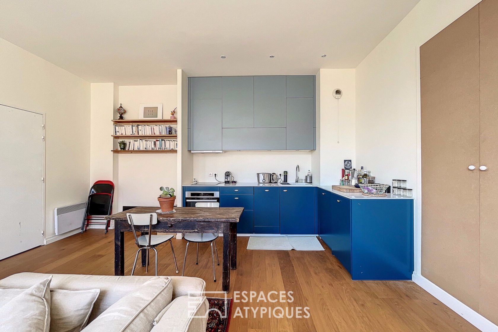 L’entrée ouvre sur une belle pièce de vie où la luminosité est omniprésente, composée d’un séjour et d’une cuisine équipée rénovée, le tout illuminé par une grande verrière offrant une vue dégagée sur les toits. Une chambre avec une verrière similaire, une salle de bain et un WC complètent ce bien.
