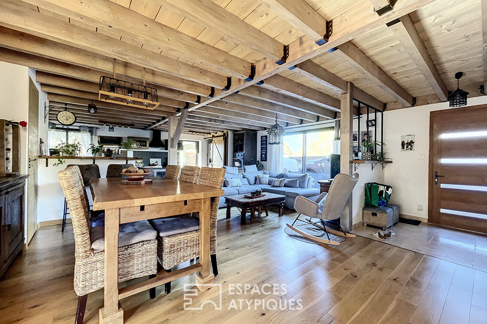 Les matériaux utilisés soigneusement sélectionnés, comme les poutres apparentes, les portes en bois massif, le parquet en chêne offrent une ambiance chaleureuse et cosy. A l’étage, un bureau sur le couloir passant a été aménagé, et dessert trois chambres mansardées dont une suite parentale avec son double dressing et une salle d’eau avec un wc. Un dernier espace accessible par ce dernier niveau est encore aménageable, d’une surface de 16m2, avec un escalier qui mène au garage en rez-de-chaussée.