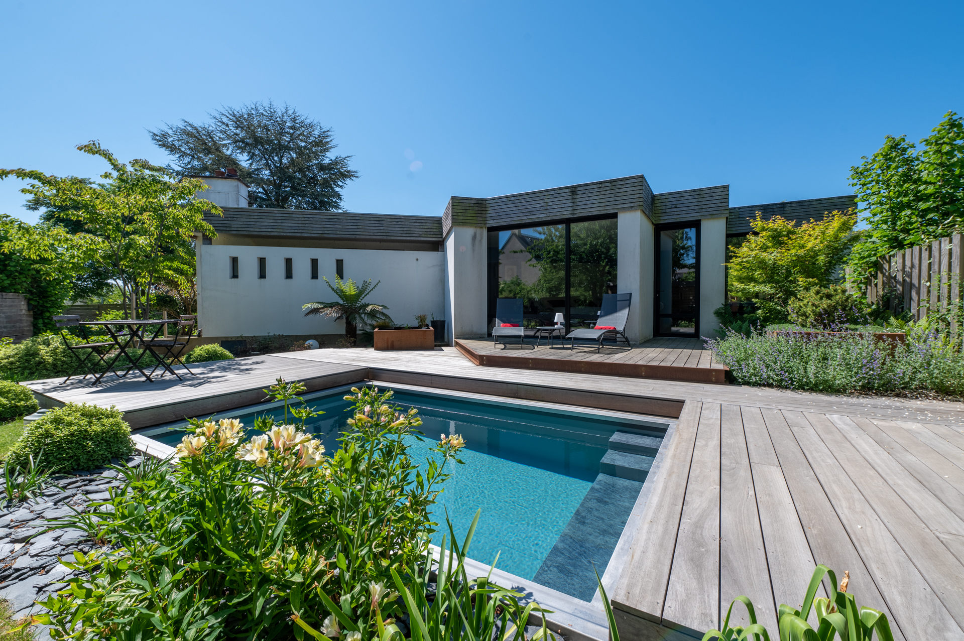 Son entrée, lumineuse et authentique, ouvre sur le salon – salle à manger bénéficiant d’une belle terrasse offrant un cadre verdoyant. La cuisine et les salles d’eau sont de très belle facture et liées d’harmonie avec l’ensemble de la maison. Une superbe suite parentale récente, réalisée avec des matériaux haut de gamme et sur mesure, de plus de 40m², baignée de lumière s’ouvre sur une terrasse et sa piscine swim n’spa telle une superbe suite privée d’hôtel.