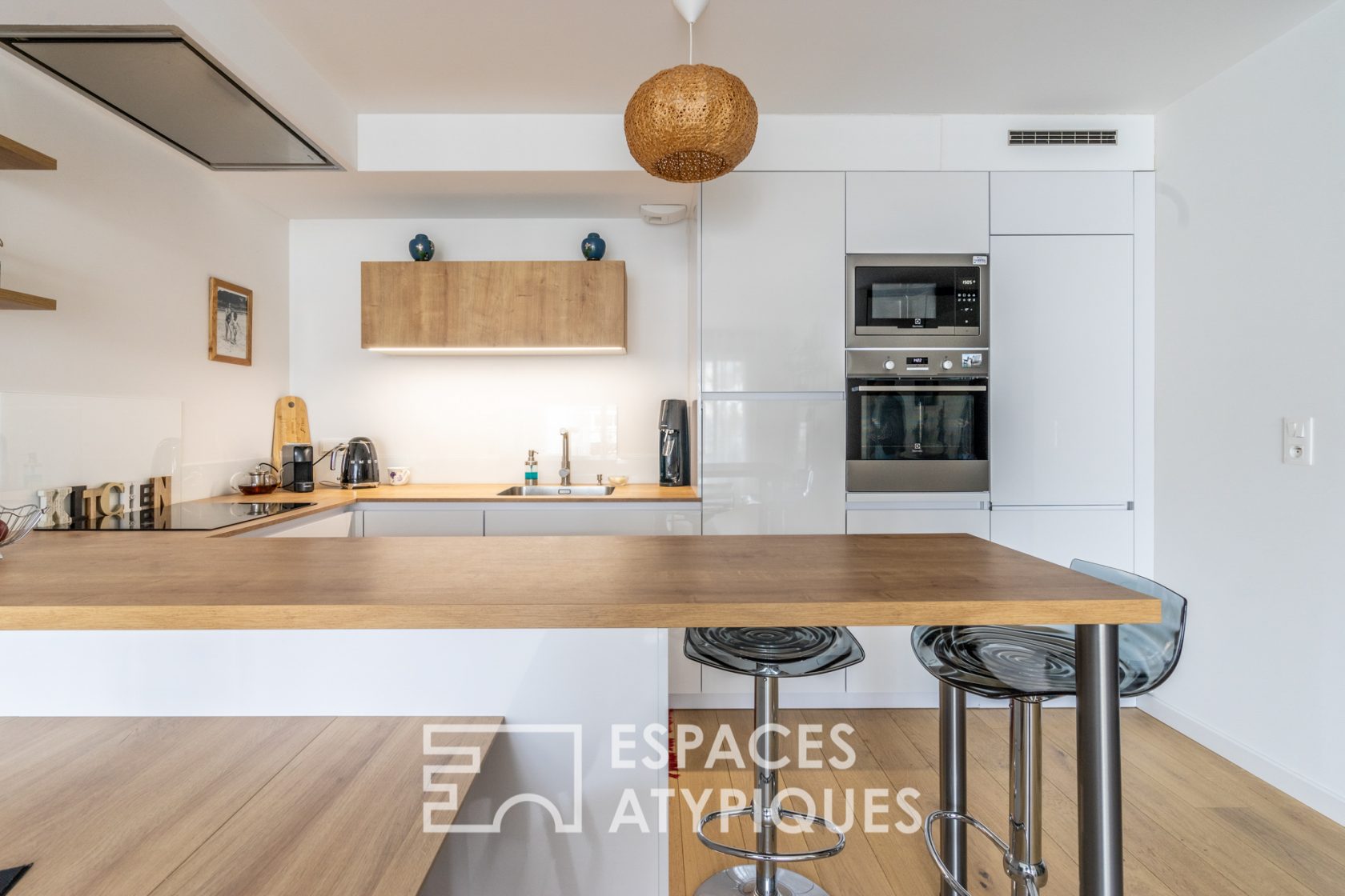 La pièce principale se compose d’une entrée avec dressing, d’un spacieux espace salon / salle à manger et cuisine entièrement ouvert, baigné de lumière et prolongé par la terrasse. Le choix des matériaux apporte beaucoup de clarté et d’élégance à cette pièce de vie. On retrouve en prolongement, l’espace nuit composé de trois chambres, dont une suite parentale avec salle d’eau et dressing. Cette partie est complétée par des toilettes indépendants et une salle de bain.