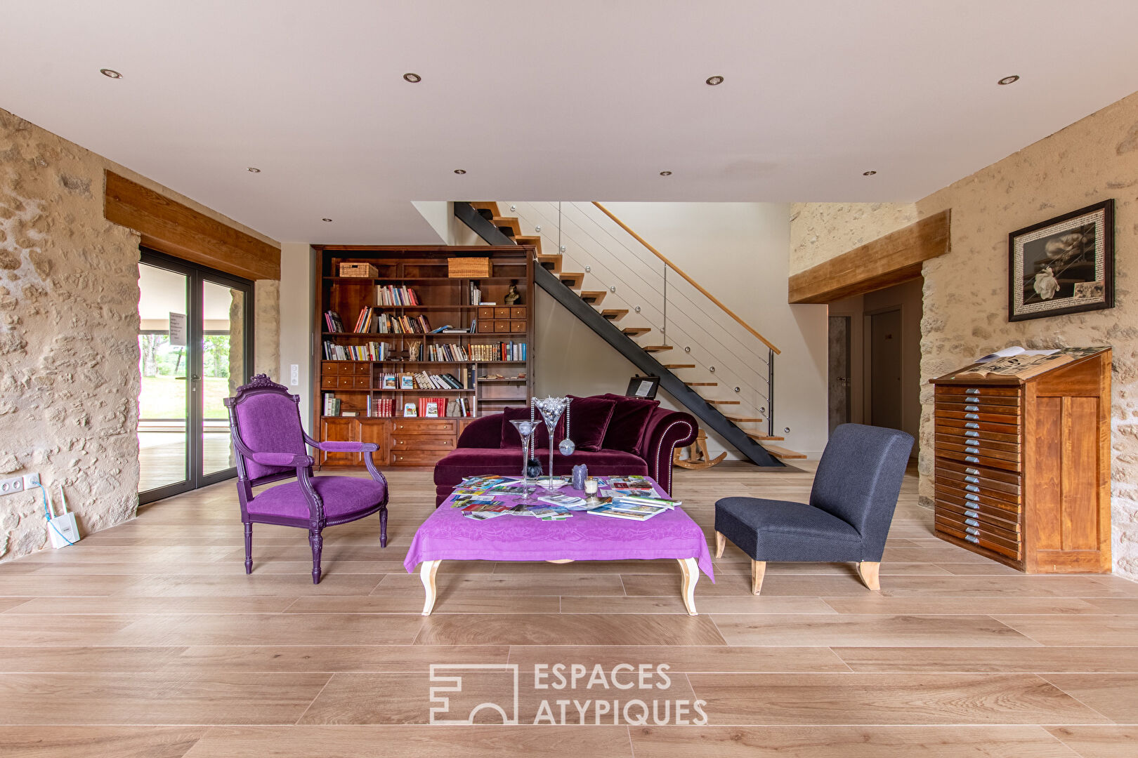 Le rez-de-chaussée est complété par une extension contemporaine de 150 m², avec piscine intérieure, baignée de lumière par de larges baies vitrées.