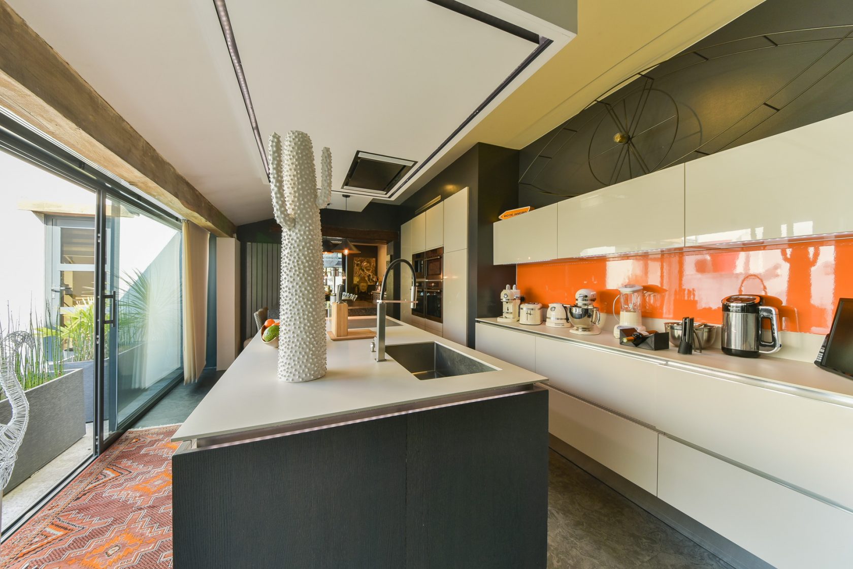 Passé le porche motorisé, un patio réalisé en résine coulé, accueille sur un ancien chai entièrement vitré et reconverti en cuisine design et sa cave à vin d’exposition, parue dans un magazine de décoration spécialisé.