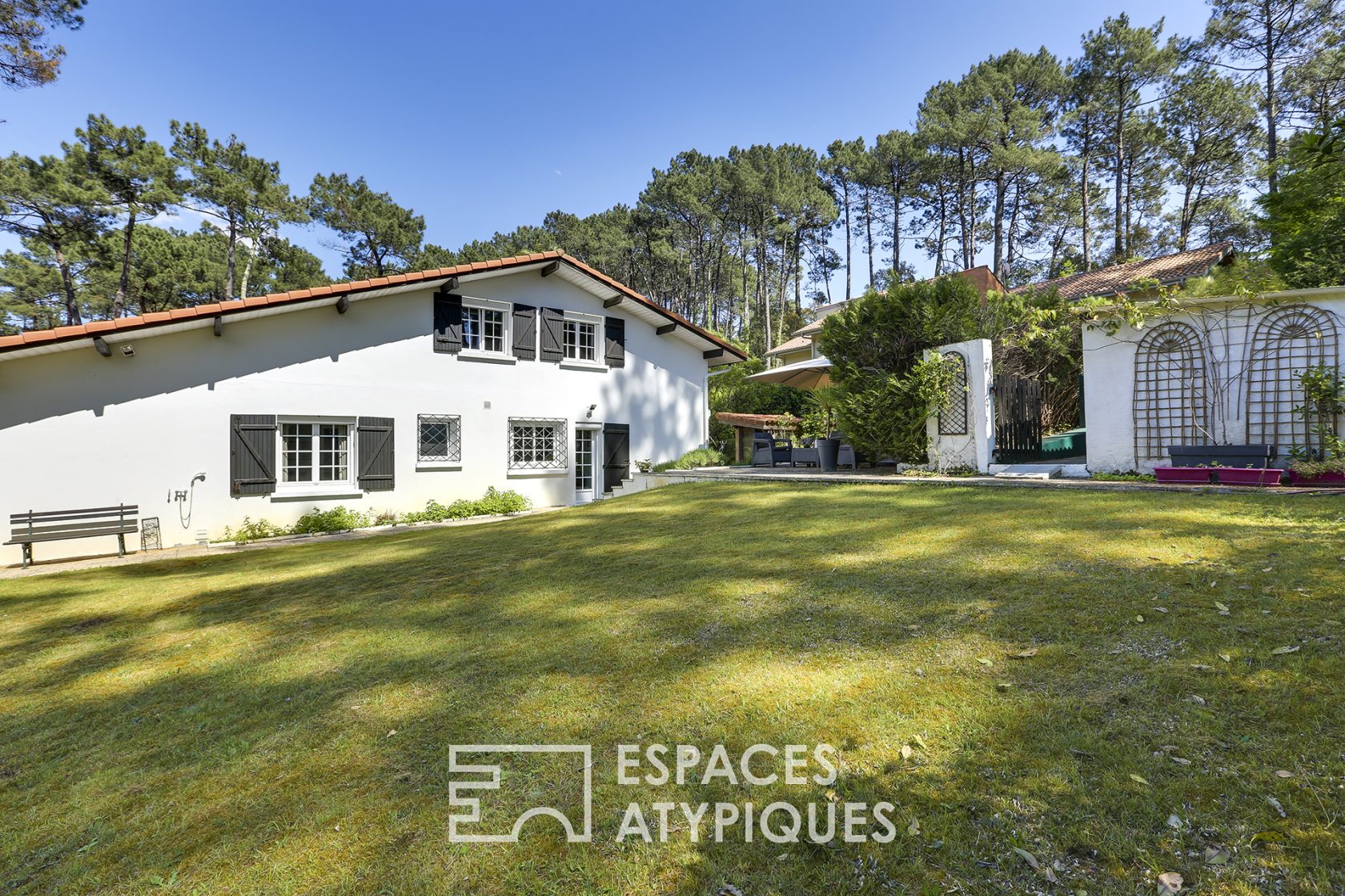 Située en lisière de forêt, cette landaise des années 70 « revue et corrigée » s’entoure d’un environnement calme, nature et ensoleillé. Sa position dominante lui confère une intimité certaine et une vue dégagée sur la cime des arbres.