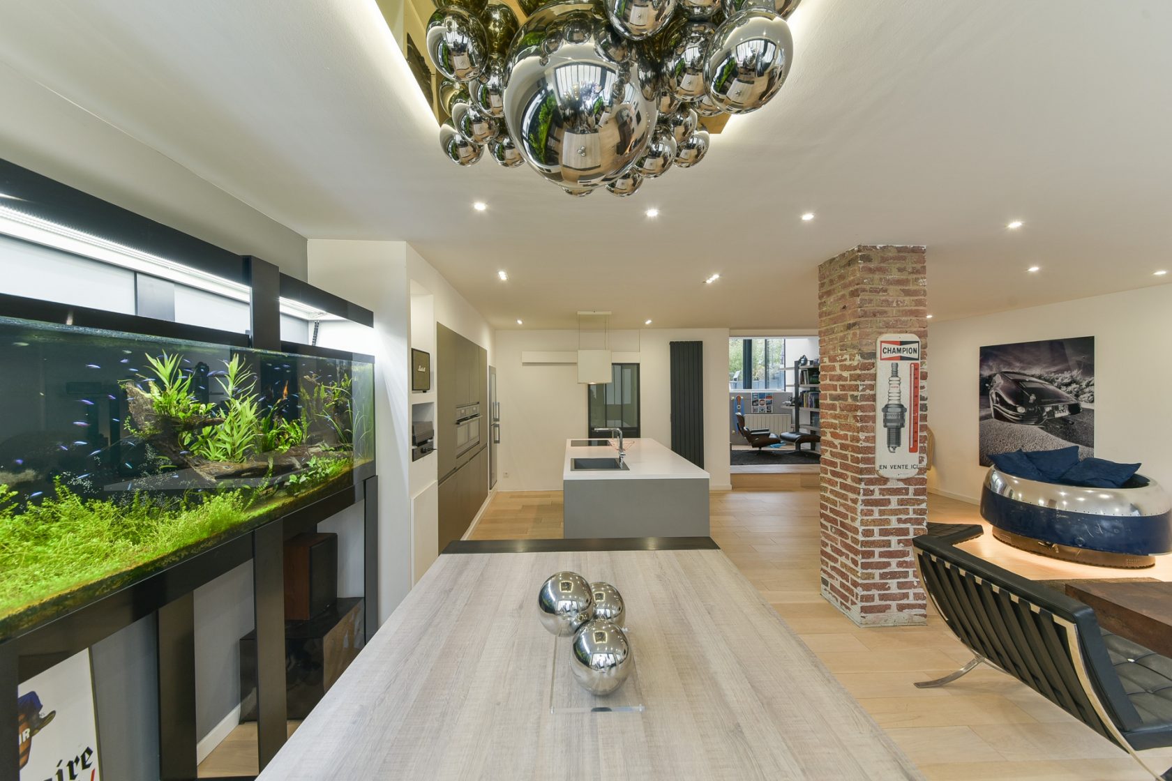 L’espace de cette grande pièce de vie de 60m² est délimité grâce à l’ilot central qui invite à la convivialité et souligne une cuisine entièrement intégrée et équipée réalisée sur mesure.