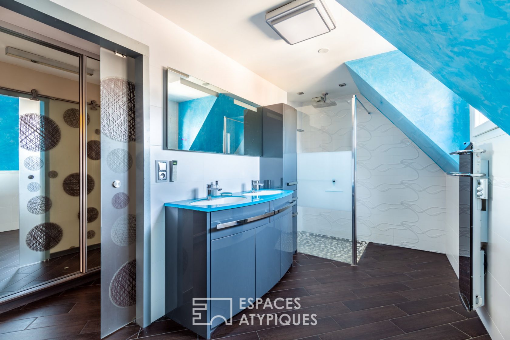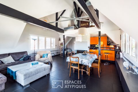 A contemporary staircase leads to the upper level, which has a mezzanine that can be used as a spare bedroom or office. On the same level, the icing on the cake of this flat is revealed: on the roofs, a private rooftoop offers a panoramic view of the town.