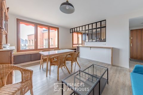 The entrance with cupboard reveals in continuity the bright living room offering a view of the half-timbered houses of Rouen.