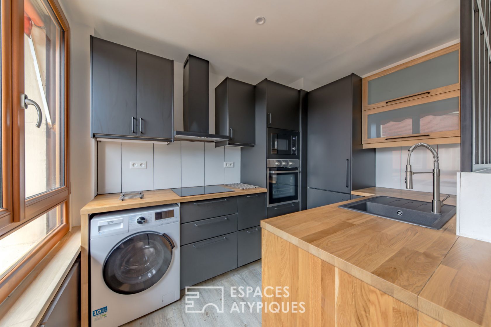 Behind an industrial-type glass roof, the fitted and equipped kitchen opens onto the living room.
