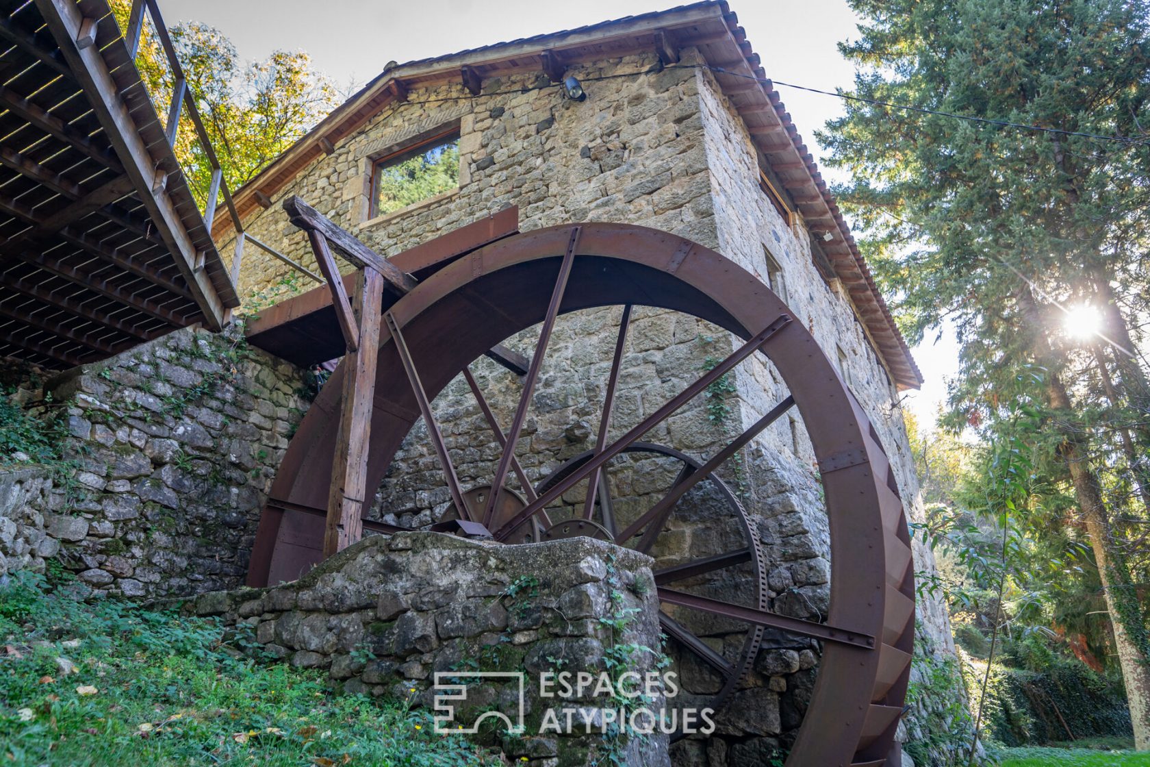 After having borrowed a small dirt road, you arrive on this mill surrounded by the forest which benefits from a river below. Calm and prosperity are the words that define this place. Inside, everything is as new, the old stones have been put forward, as well as the floor of the lower part to keep the soul of this place.