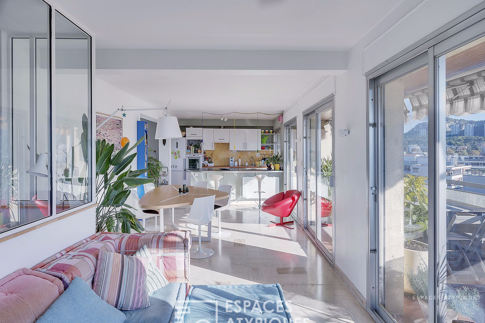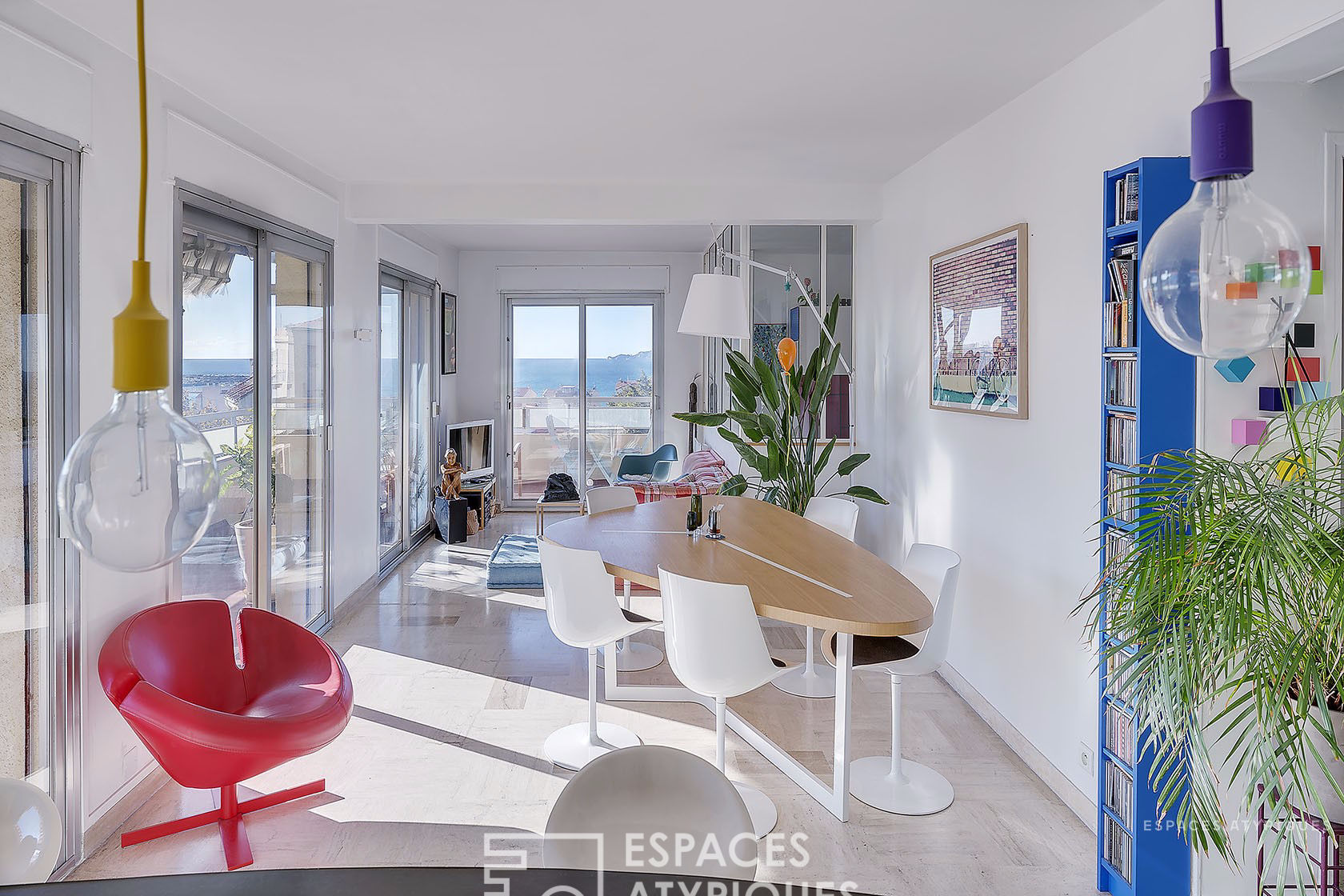 Located in the village core of the Old Chapel, this southern apartment of 90 sqm treated in contemporary, has a terrace of 45 sqm with sea view, the second and last floor of a small residence with swimming pool. In the quiet of the surrounding nature, between sea and mountains, its architectural typology is that of a modern apartment where one finds the wood, natural stone, aluminum and concrete vanguard achievements of the late 70. the vast living space, kitchen and living room, extends along the terrace and bay windows on the horizon. A glazed module takes office. Next night, two bedrooms, one with a sea view, with shower room and bathroom. A boxed parking complete this property. Close to the shops, beach, schools and public transport. Contact: Philippe 06.69.25.19.75 Copropriété de 18 lots (Pas de procédure en cours). Charges annuelles : 2400 euros.