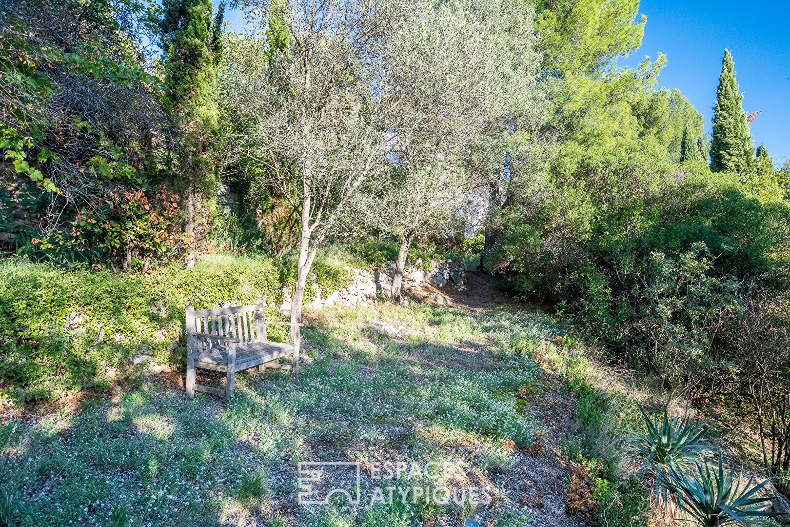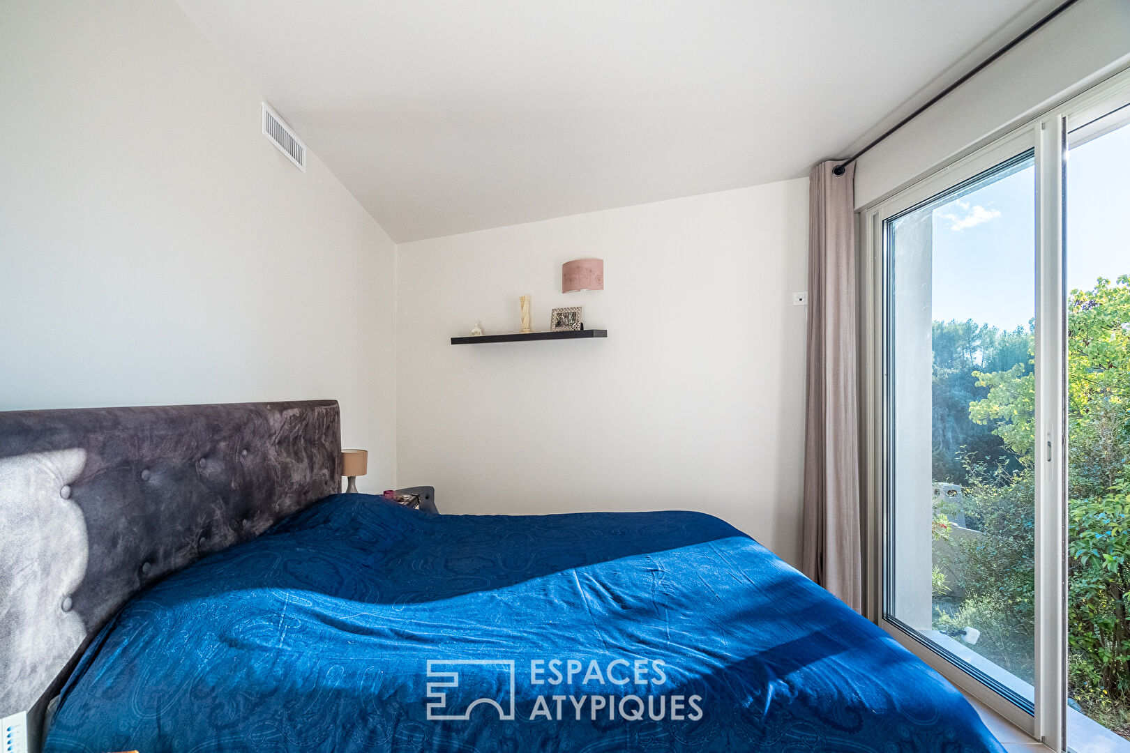 The garden level accommodates the sleeping area consisting of two bedrooms, a dressing room and a large bathroom. Upstairs, the open kitchen communicates with the living room extended by a 40m2 terrace facing south. The bay windows with pockets and the panoramic view which extends to the sea ensure a Usonian communion with nature. A third bedroom with independent entrance completes this level. Close to schools, highways, public transport and shops.