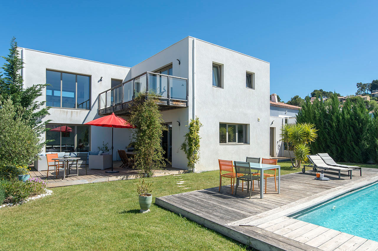 The contemporary architecture of this 230 m² house build in 2010 opens on a plot 1000m² facing South and embellished with a heated pool. This family house offers a precise and uncluttered geometric simplicity. It is composed of large spaces, neat services and a beautiful light. It combines glass, wood and aluminum with perfection from its wooden terrace with glass sliding windows on all sides of the house. From the entrance an elegant lobby with its majestic brushed steel fireplace sets the tone. A spacious living room with white walls takes advantage of the superb volumes bathed in light. The open kitchen with clean, functional lines plunges through huge windows onto the terrace and pool. An air staircase made of blond wood leads to the sleeping area. A blue Klein door reveals the master bedroom, the bathroom and the dressing room that opens onto a terrace. Two further bedrooms and their bathrooms, an office and a mezzanine complete the sleeping area. A garage and parking facilities adorn this goods. For a comfortable and peaceful family life. 10-minute away from the village center of Allauch known for its tranquility and charm.Contact : Marie-pierre, 07.63.92.19.75.
