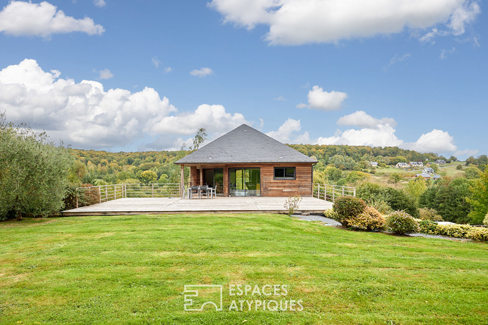 In the heart of Surville, this house is spread over two levels, both on the ground floor thanks to the sloping configuration of its 2.7-hectare wooded plot. Its generous volumes and its view give it a unique character. Designed as a living space open to nature, the interior covers approximately 260 sqm and is organized around a vast living room bathed in light thanks to large bay windows. The contemporary equipped kitchen extends into a cozy living room, structured around a suspended fireplace. The sleeping area, on the lower level, consists of four bedrooms including a master suite with a shower room. The amenities continue with a billiard room, a wellness area including a jacuzzi, sauna, hammam, fitness room, and a wine cellar, designed to combine comfort and conviviality. Outside, the house opens onto a vast terrace where a heated swimming pool offers unobstructed views of the valley. The property is set in a landscaped garden and a preserved natural environment, conducive to relaxation and well-being. An outbuilding of approximately 140 sqm completes the property with a double garage, cart shed and two offices upstairs, leaving the possibility of creating an independent space to accommodate family or friends. Located in the immediate vicinity of Deauville and Pont-l’Évêque, the property benefits from a calm and green environment while remaining close to shops, schools and communication routes. This property, combining contemporary design, high-end services and natural setting, stands out for its unique and privileged character. ENERGY CLASS: C / CLIMATE CLASS: B Estimated amount of annual energy expenditure on average energy prices indexed to the year 2015 (subscription included): EUR1,353. Information on the risks to which this property is exposed is available on the Géorisques website: www.georisques.gouv.fr
