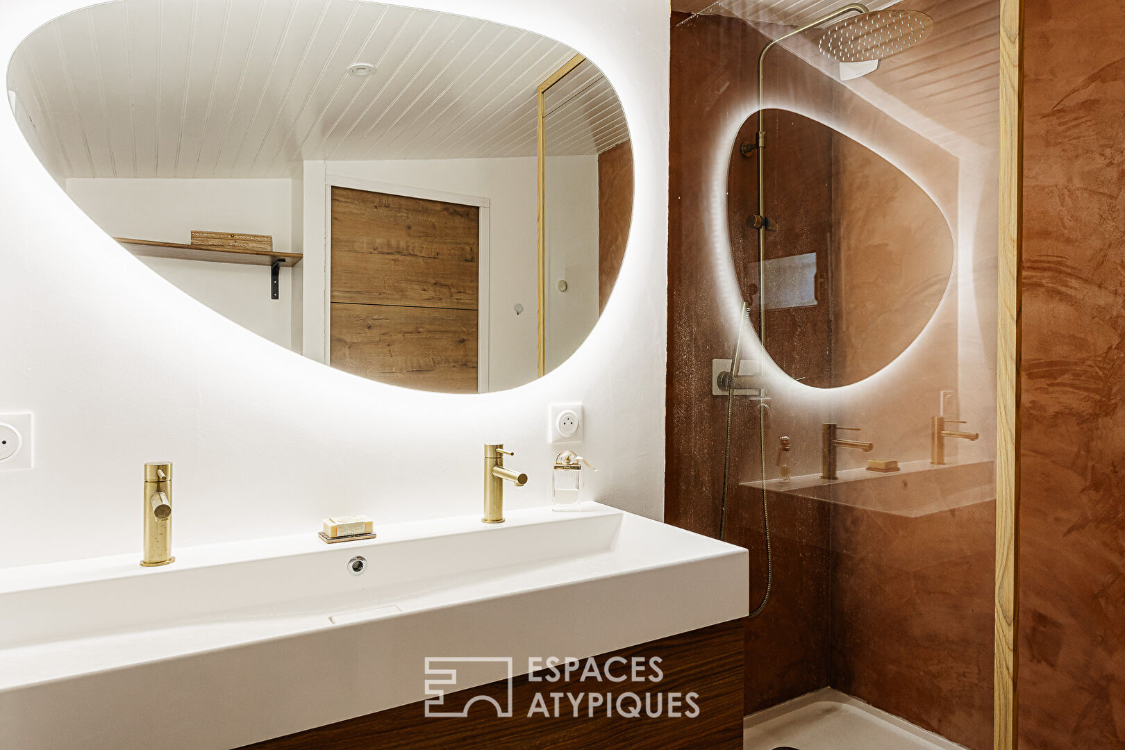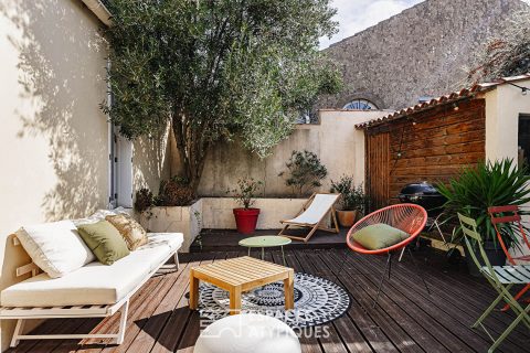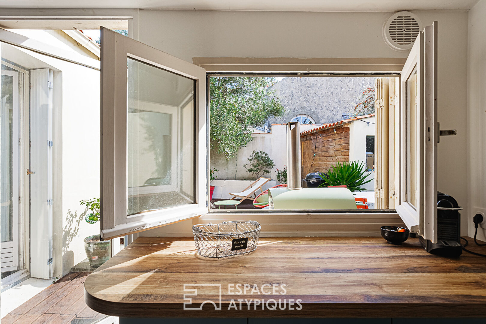Located in the heart of the Tasdon district, this recently renovated single-storey shop, typical of the district, is built around a quiet and confidential garden terrace behind a discreet facade. Past the entrance, the living room benefits from a high ceiling and a brightness which invades this beautiful volume thanks to the double exposure, providing a pleasant daily life. The wood stove, the main heating element, and the opposite stone wall are undoubtedly the charming asset of this room and this house and the promise of warm and friendly moments. The two bedrooms of the house benefit from a mezzanine, adding storage, a window onto the garden and a large cupboard for the second. Separated from the living room, the fitted kitchen is harmonious in the combination of light woods and pastel colors. Its large window opening onto the garden is an invitation to lunch outside. In the extension, the laundry room and the bathroom, in warm colors, complete the layout. The garden, hidden from view, is the strong point of this family shop. Laid out on a wooden and planted terrace, it stands out as a friendly and calm place, ideal for recharging your batteries. A stone’s throw from all amenities and La Rochelle train station, a property ideally located and protected from traffic. ENERGY CLASS: E / CLIMATE CLASS: B