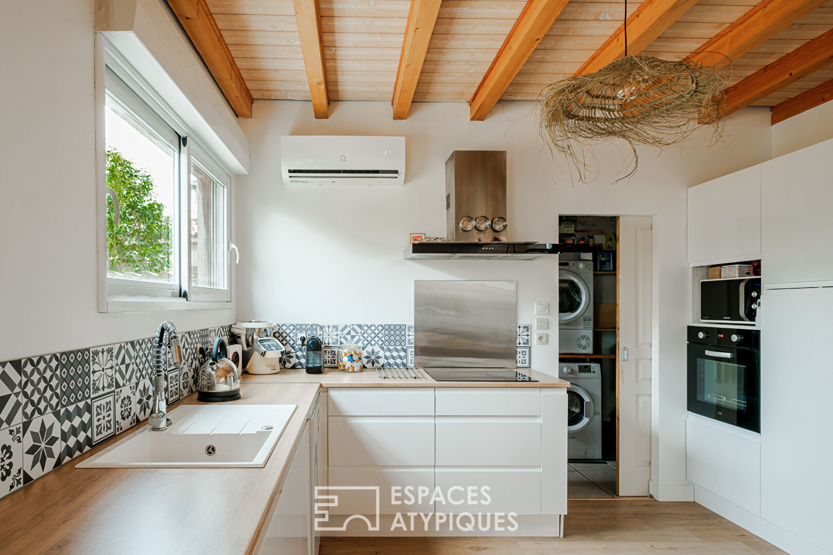 On the house side, the large 42 m2 living room is a warm place with its light-colored wood. Crossing and facing the garden, a beautiful light takes possession of this open space. The living room area benefits from a bay window extending onto a terrace. The kitchen, for its part, communicates with the pantry/laundry room for the practical part.