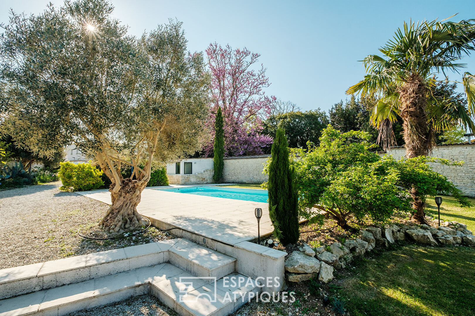 Facing due south, it stands out for its generous volumes, its landscaped garden enclosed by stone walls, its heated swimming pool and its numerous outdoor features, including a covered terrace, garages and several parking spaces. Renovated around ten years ago, this old building combines old-world charm with modern features.