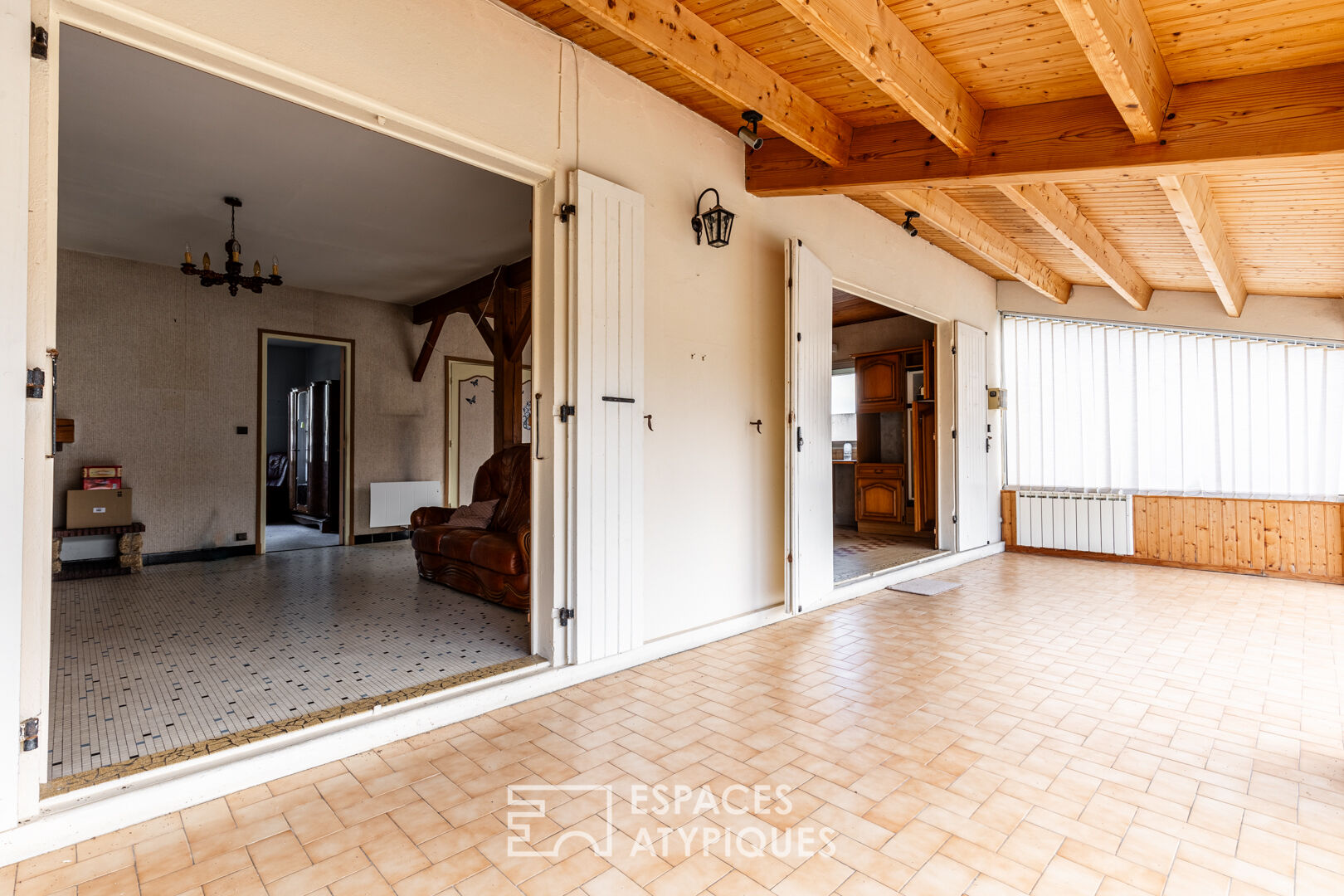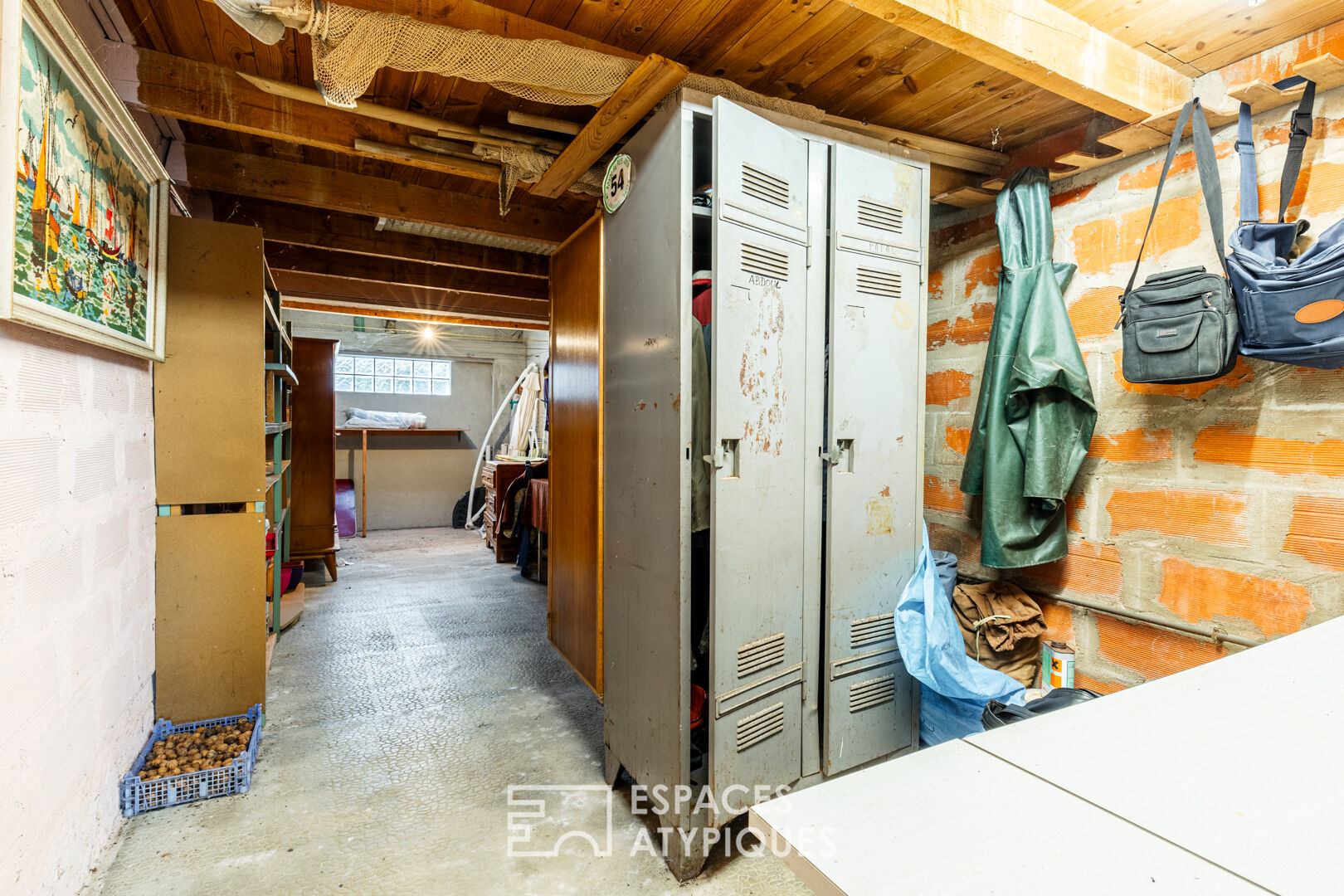 The main house with its three rooms reveals a veranda initially converted into a dining area, a lounge area with its corner fireplace and its kitchen. An office space and a bedroom facing the garden are complemented by a bathroom with integrated toilet. Adjoining the house, a space awaiting project and a workshop (former garage) give access to a second bedroom under a crawl space upstairs. A masonry cellar under the house with access from the garden completes this first part. An independent two-room workshop with water point and an open fireplace offers a second project while the independent garage in the first part of the plot offers a third project. Project which reveals a single-storey garage with a bathroom and a toilet. Upstairs, a platform divided into two parts under ramps was once a space dedicated to the youngest with an office-games area and a bedroom.