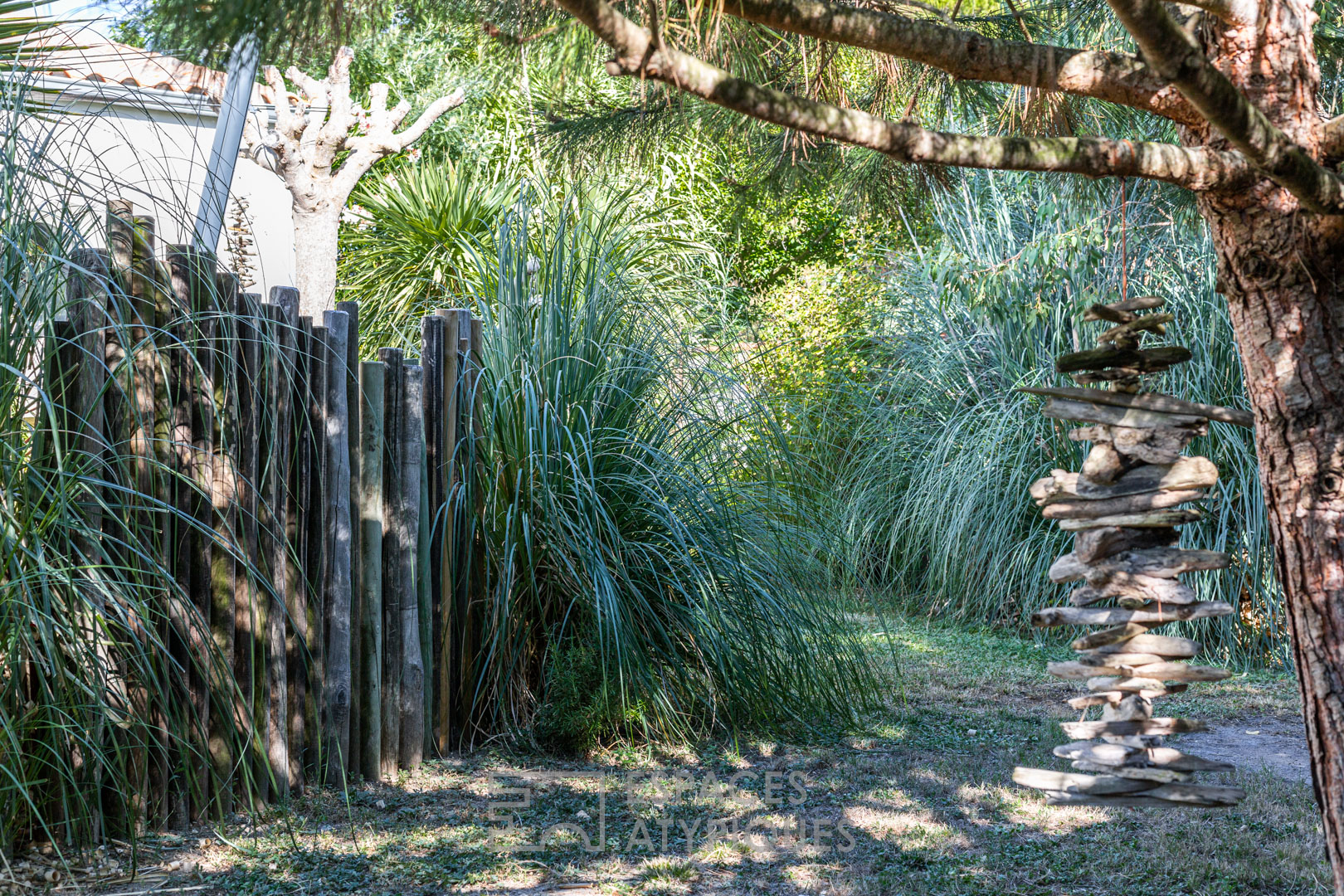 Outside, around the swimming pool, another universe is revealed, a summer lounge decorates it for moments of plenitude. The rustling of the waves a little further calls for surf sessions or the charm of a siesta sheltered by the pergola. The landscaped garden protects and ensures that no one will be disturbed.