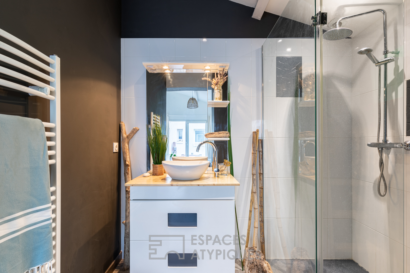 The house with an area of 142 m2 is organized around the living room, the centerpiece. The materials and colors are chosen with care, the volumes generous and user-friendly. It includes the American kitchen and gives access to two beautiful bedrooms which each benefit from an adjoining bathroom, a terrace for one and a patio for the other.