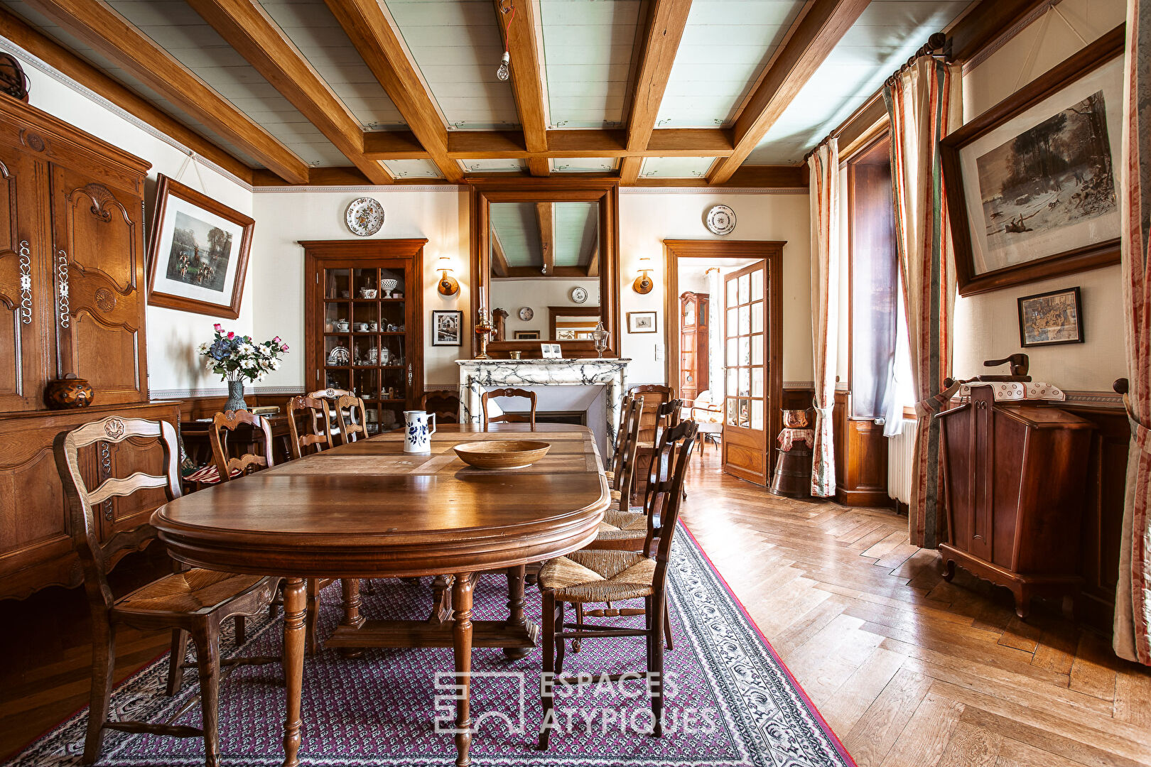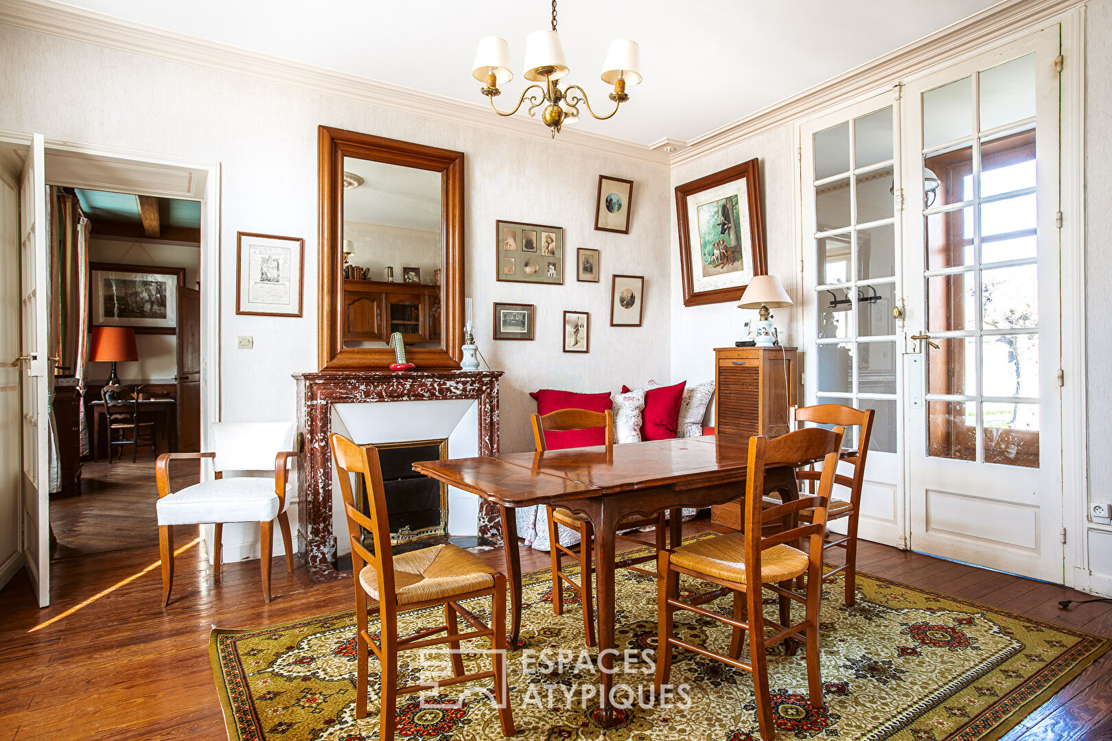 On the ground floor, the rooms follow one another. A small and a large living room are separated from a very large dining room and the majestic entrance. The kitchen communicates with the various service rooms, as the codes of the time suggest. In continuity, an office is transformed into a games room. From there, a pleasant light invites you to pass towards the most magical place of the property: a large old tropical greenhouse, with its magnificent glass roof. Due to its volume, it easily accommodates plants and large tables. Upstairs, a landing and a long corridor lead to a total of seven bedrooms, three shower rooms and two bathrooms. In order to accommodate people with reduced mobility, a bedroom with its own bathroom has been created in an annex accessible from the front garden.
