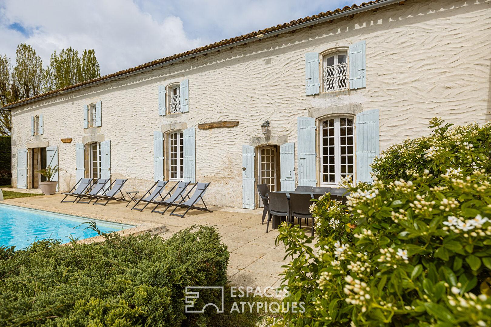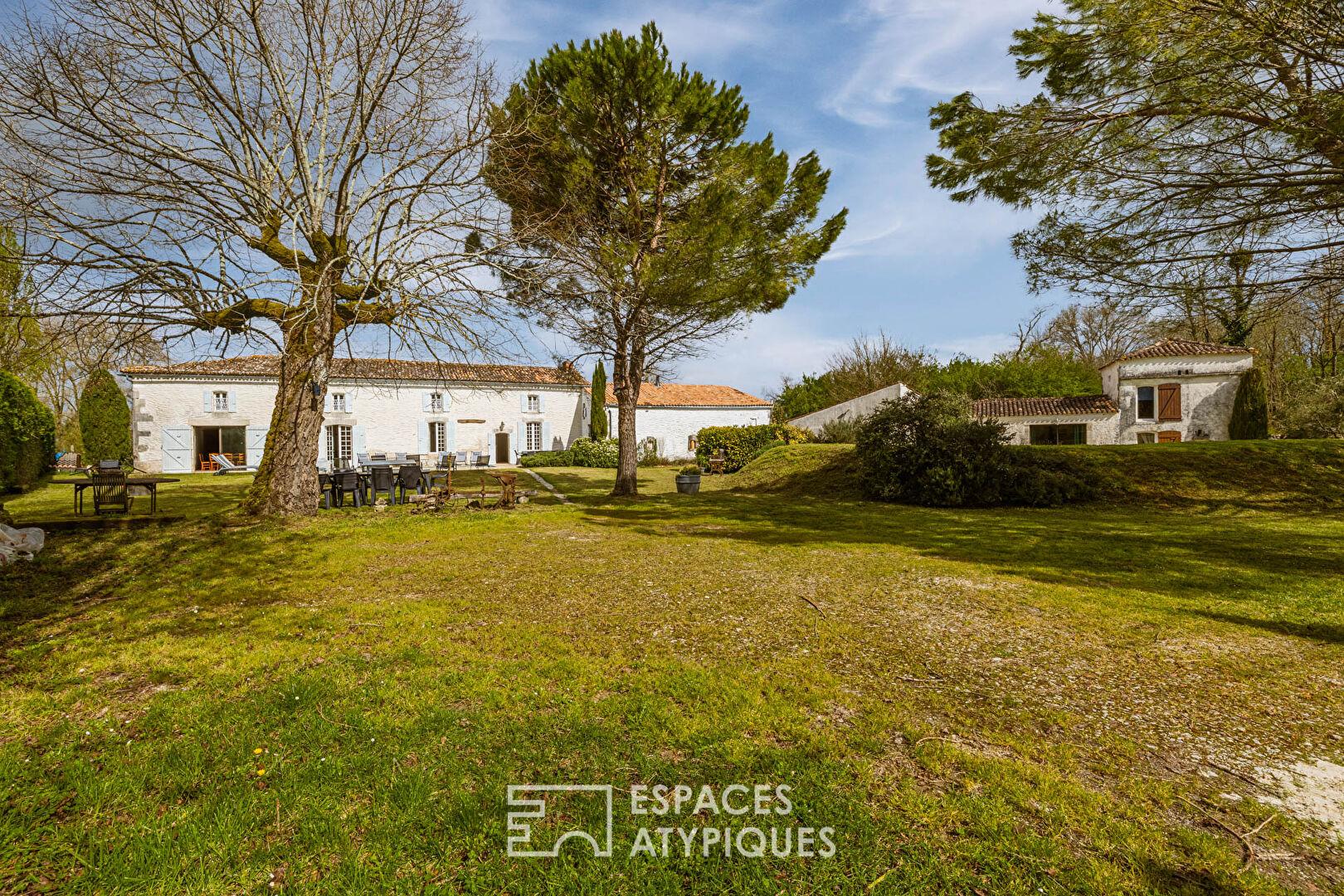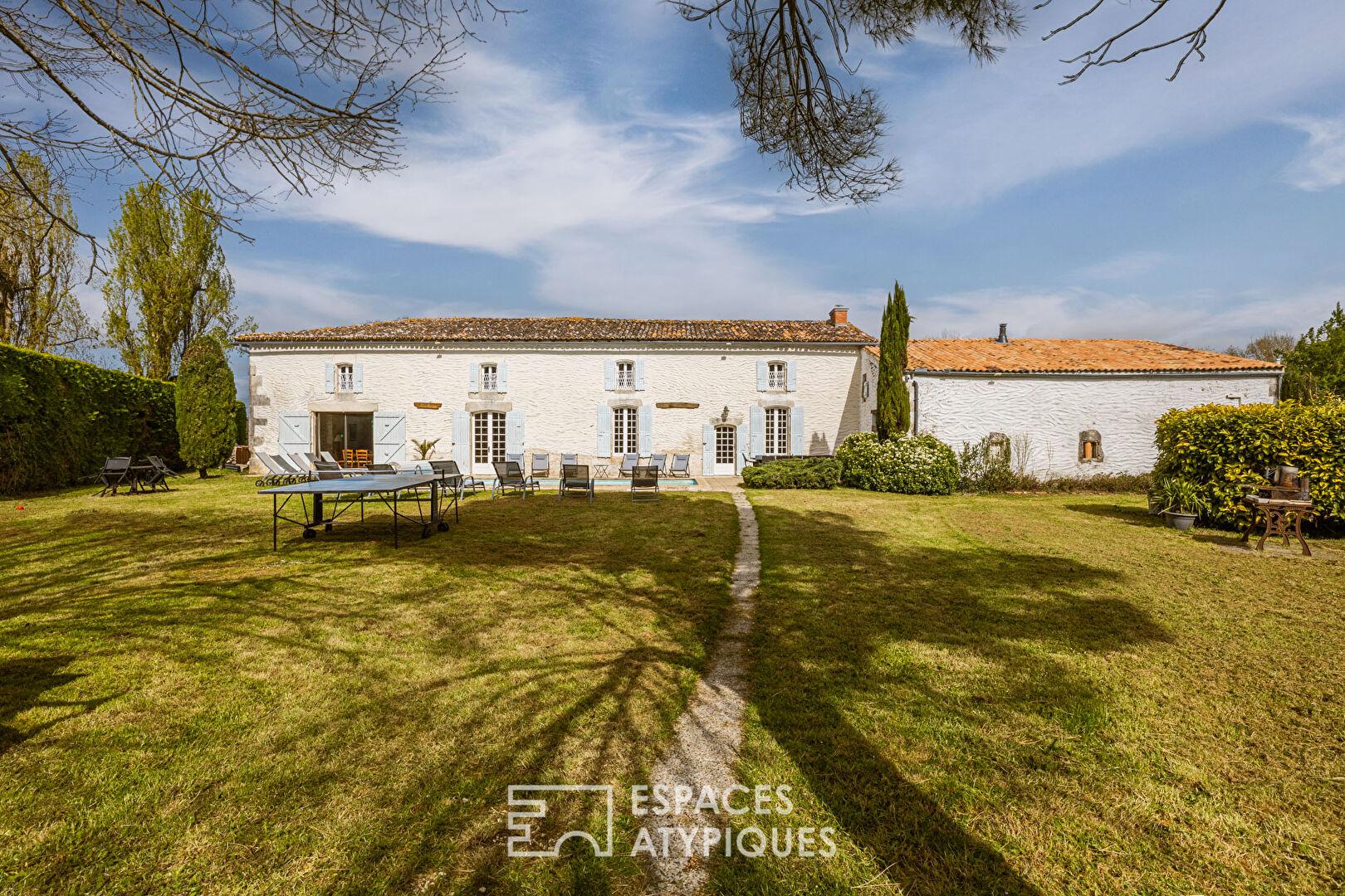 Located in Corme-Écluse, just 15 minutes from the beaches of the Atlantic coast, this property unfolds across landscaped grounds offering peace and privacy.