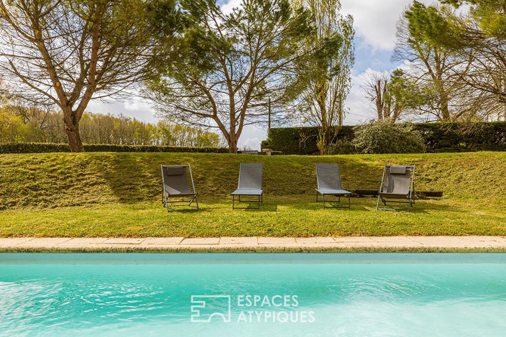 The living spaces, with their rustic style, exude a warm and timeless comfort. The farmhouse’s seven bedrooms promise wonderful moments spent with family or friends. The second house offers an intimate space, sheltered from the neighboring farmhouse, and provides three additional bedrooms, including a unique alcove nestled in a former stone dovecote. The outdoor spaces are a major asset, offering versatility, with each house boasting a swimming pool.