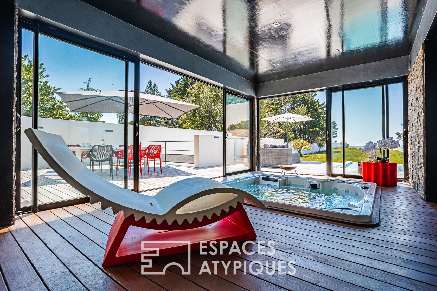 Located 15 minutes from La Rochelle, in a popular and sought-after area for its calm and proximity to the sea, this exceptional villa from 2011 is built on 2000 m2 of land without vis-à-vis with direct access to the ‘ocean. The sea view is breathtaking from all the living spaces and most of the bedrooms. Cubic realization, it develops approximately 337 m2 of living space and benefits from numerous ancillary rooms. Its volumetry is designed with alternating cladding and glass walls which gives it pleasant light and a unique view, facing the outside. The foreground is the main space, articulated around the majestic curved staircase, made to measure. The lounge area, with its fireplace and bar area, extends onto the terrace. The living room opens onto the kitchen with high-end materials and equipment, as well as the SPA. A master suite of 50 m2 is organized around a patio and has a bedroom with a view of the swimming pool and the island of Aix in the distance, a dressing room and a bathroom with a spa bath. An office and a second suite with a shower room complete this level. Dedicated to the family, the floor has a games room on the mezzanine open to the living room and three other suites which each have a bathroom. A roof terrace hosts a solarium with a breathtaking view of the garden and the sea. The full basement hosts the rooms devoted to leisure with games room, room dedicated to the cinema, air-conditioned cellar and garage allowing the parking of four vehicles . The garden also has surprises in store, with a singularly designed infinity pool, a summer lounge, a brazier area, and a beautiful lawn. A gate at the end of the garden provides access to the creek below with a view of the island of Aix in the distance. An exceptional place for lovers of beautiful interiors and wide open spaces. ENERGY CLASS: C / CLIMATE CLASS: A. Estimated average amount of annual energy expenditure for standard use, based on energy prices for the year 2019: EUR1,946