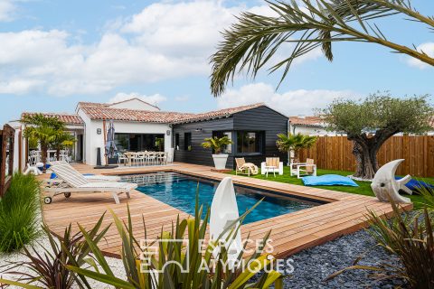 Located in the immediate vicinity of the beaches in the town of Rivedoux, this recent exceptional villa is the result of a perfect creation which combines the charm of traditional Rais with the comfort of high-end materials. As soon as you enter the reception courtyard, the large modern glass roof blends perfectly with the different stone and wood walls. Several spaces allow you to enjoy the outdoors either in the sun or sheltered under the awning which gives a glimpse of the rear garden.