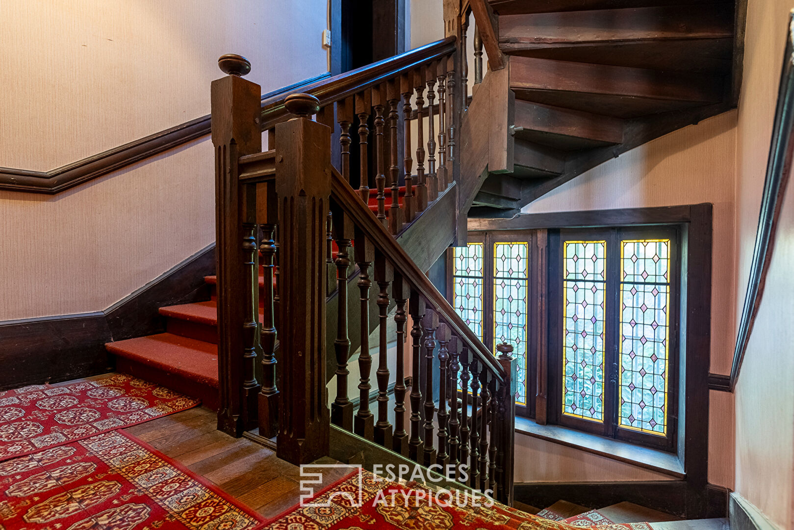 The entrance opens onto a hall with one of the centerpieces of the house: its solid wood staircase marked by its stained glass panels. The ground floor includes the living space. On the left, an office has access through glass doors to the painter’s former workshop. Here, the volumes are most remarkable. A ceiling height of more than 4m which is highlighted by its original French ceiling. Facing him, the dining room is colored with brightly colored stained glass windows and several works painted on canvases mounted on the story of La Fontaine’s fables. Continuing on, the kitchen space needs to be completely rethought.