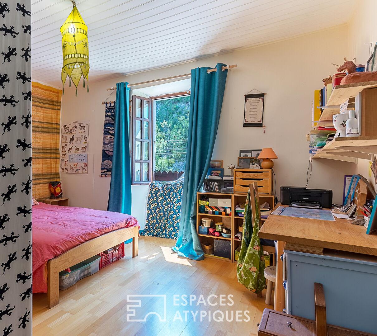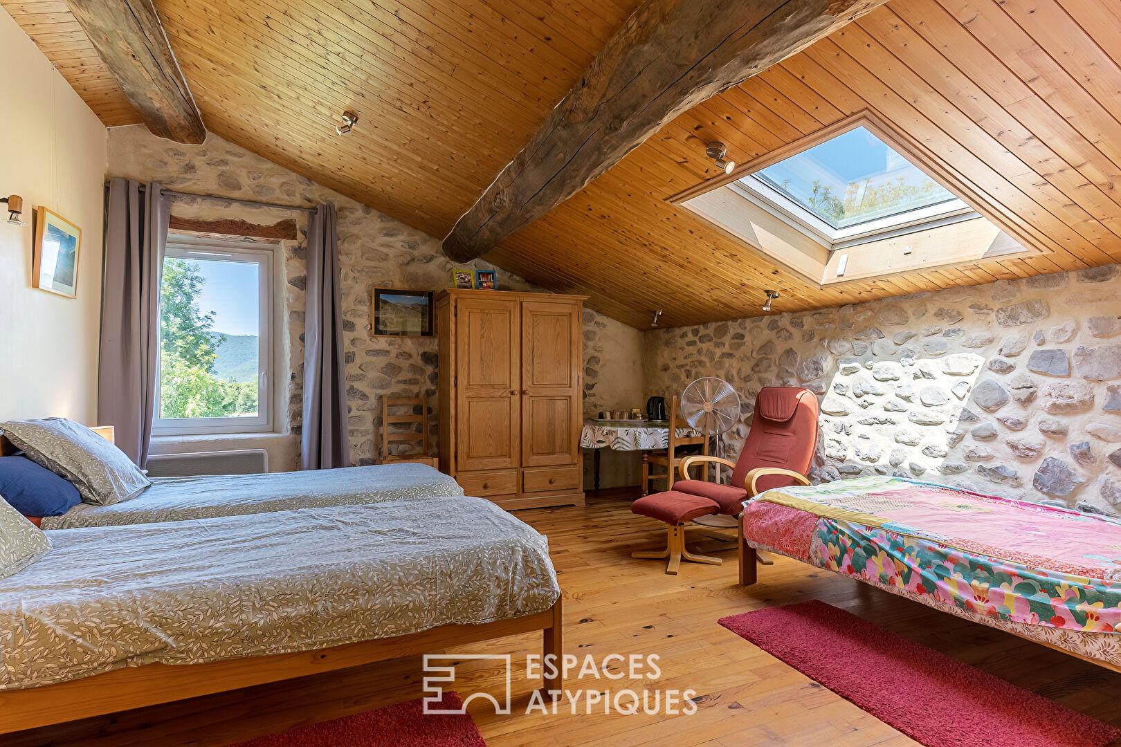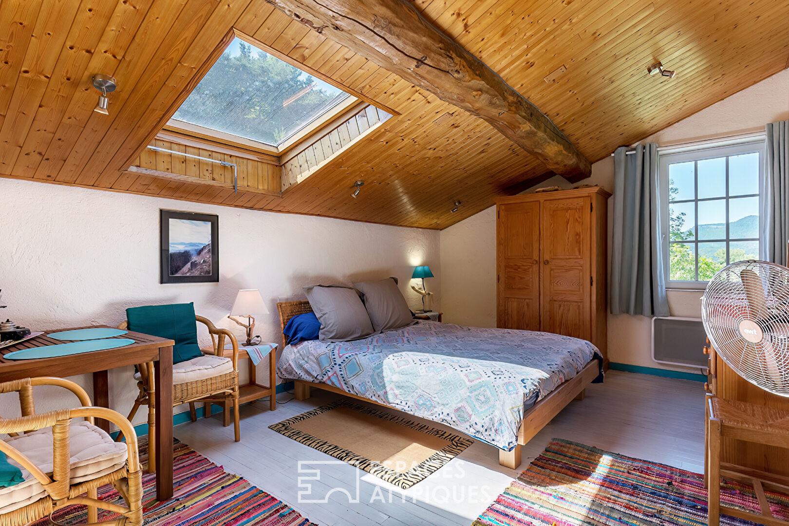 The main house, thoughtfully laid out, includes a lovely kitchen, a bright living room, and three bedrooms upstairs. An attic offers potential for conversion or further development to suit your needs. Outside, a large terrace overlooks a verdant plot of nearly one hectare, perfect for enjoying sunny days or hosting al fresco meals.