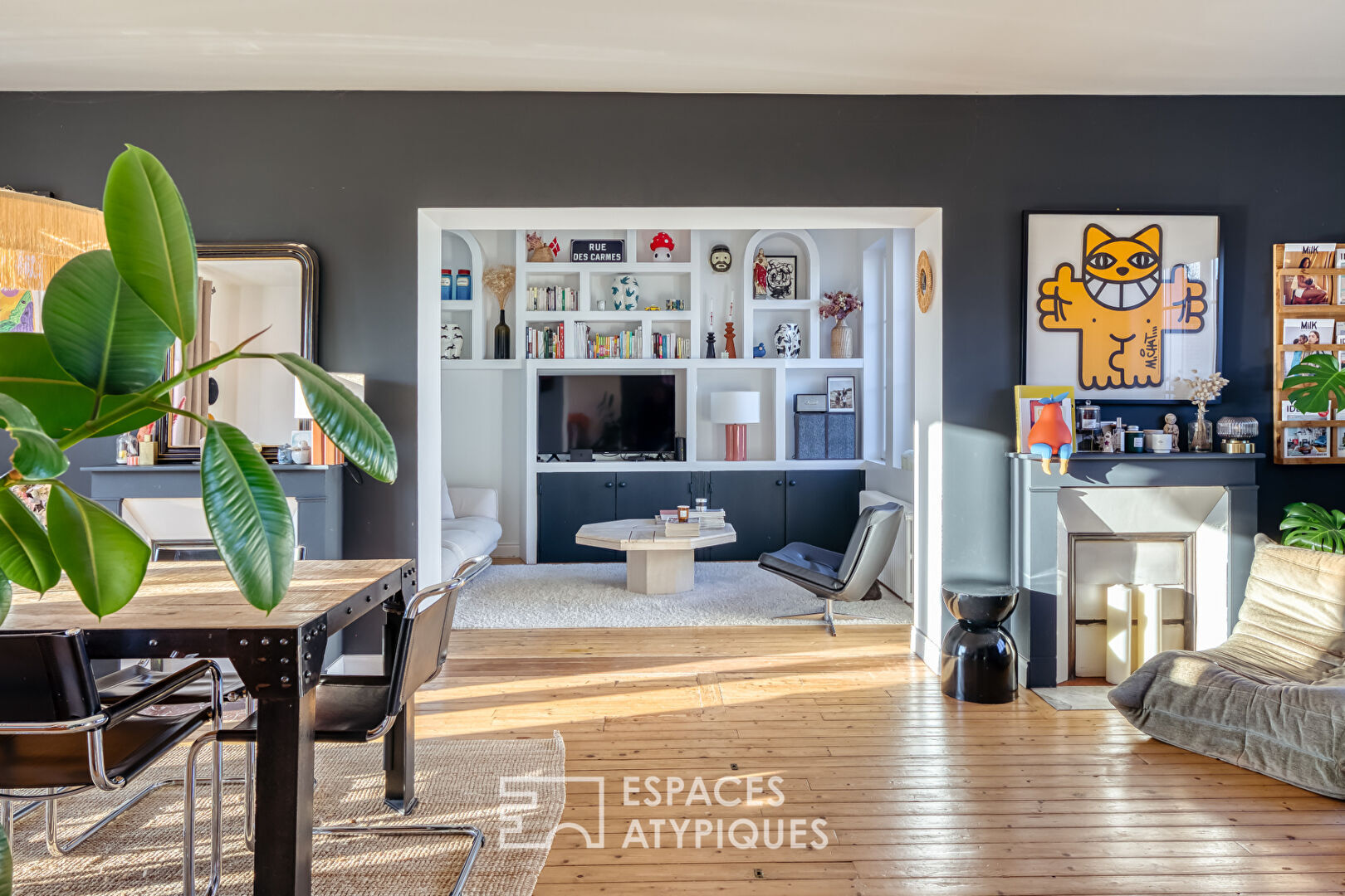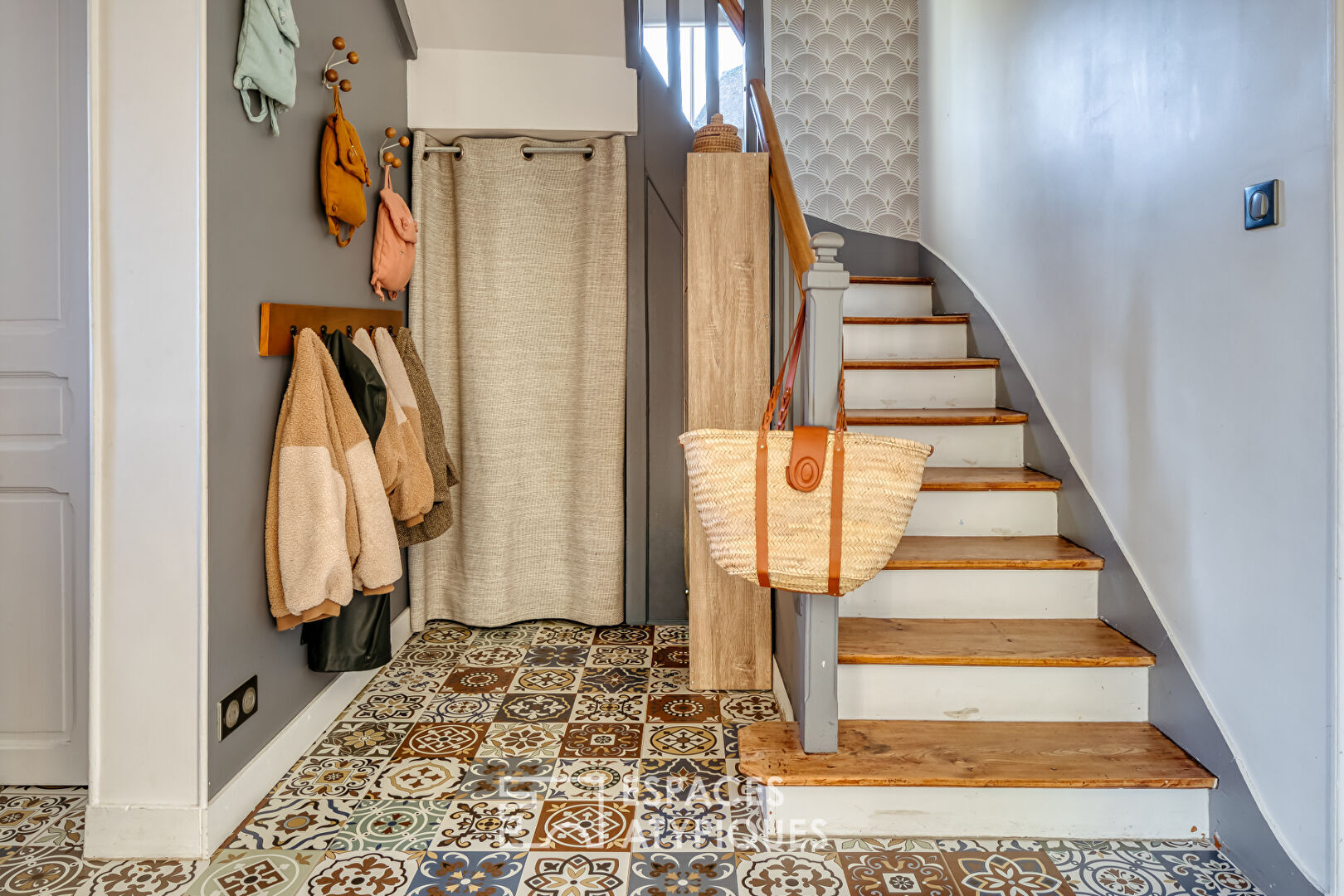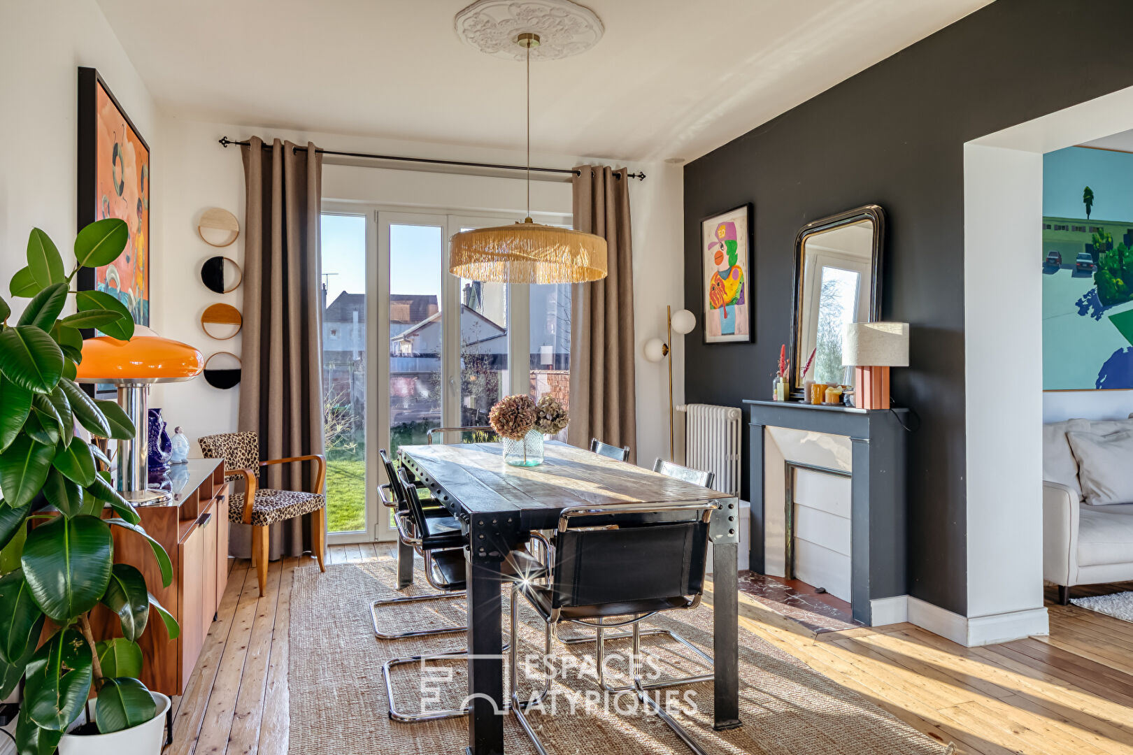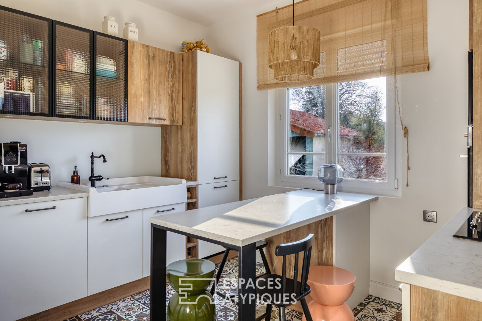From the moment you enter, the atmosphere is subtly revealed. A vestibule, designed to provide access to a separate WC and a small laundry area tucked under the stairs, completes the functionality of the ground floor. The open-plan living area immediately captivates with its original parquet flooring, decorative fireplaces, and custom-built bookcase with its striking lines?a true signature of the home. The beautifully appointed kitchen (cement-effect tiles, farmhouse sink) is very well-equipped and offers a lovely, functional 12 square meters.
