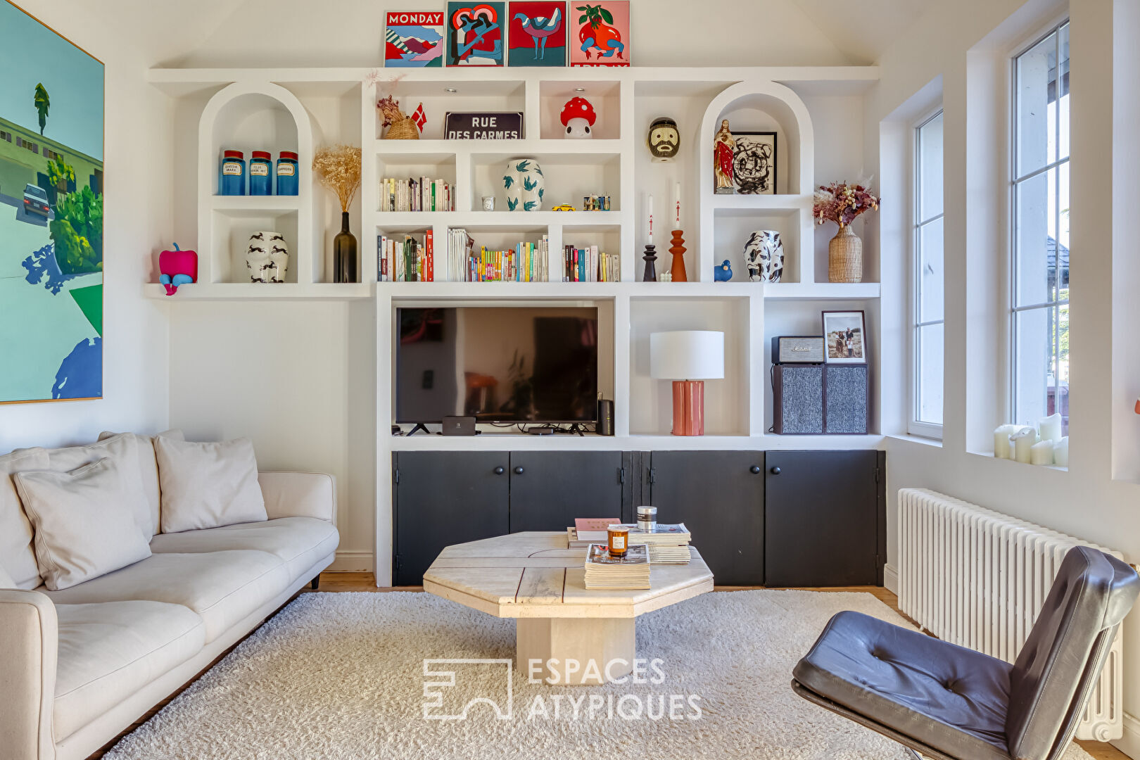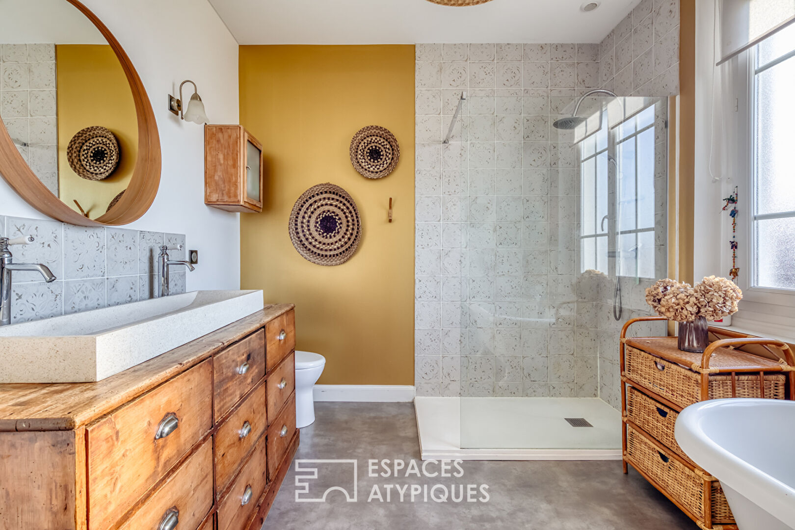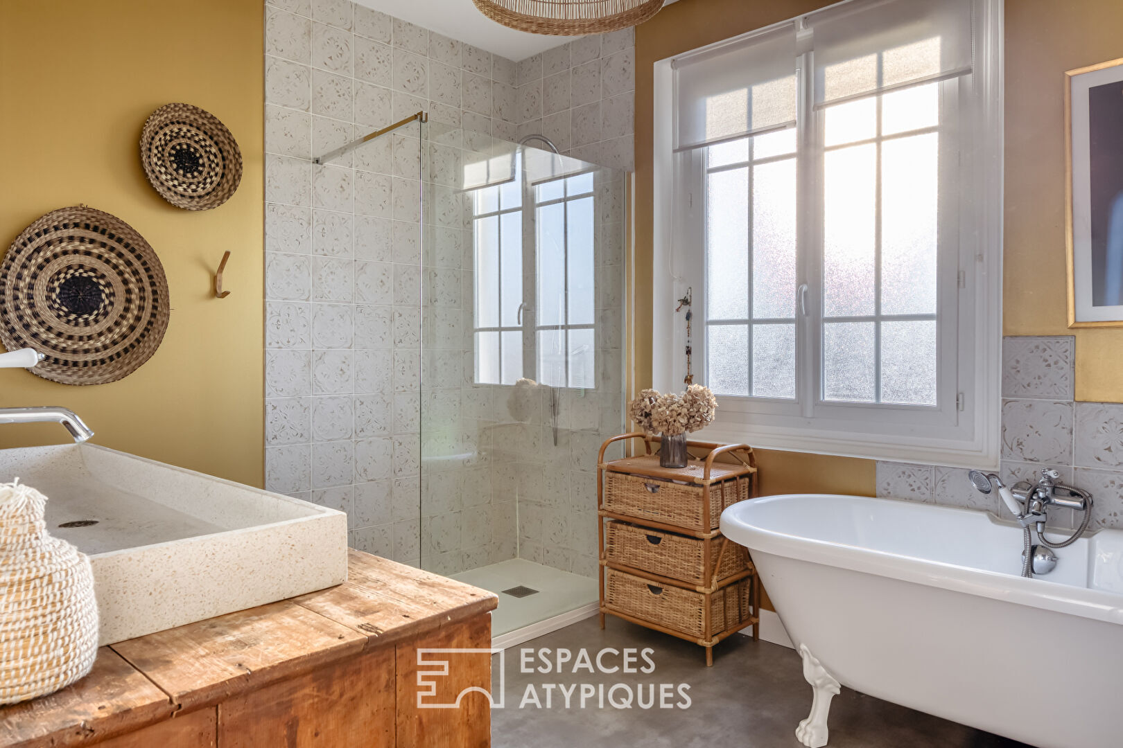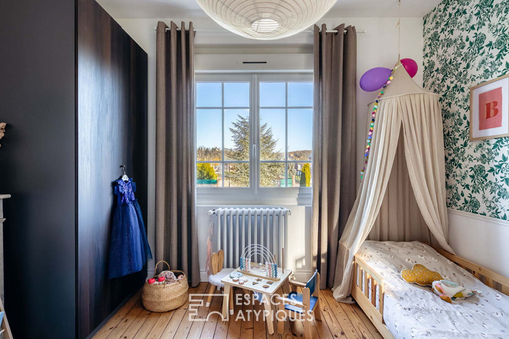 From the moment you enter, the atmosphere is subtly revealed. A vestibule, designed to provide access to a separate WC and a small laundry area tucked under the stairs, completes the functionality of the ground floor. The open-plan living area immediately captivates with its original parquet flooring, decorative fireplaces, and custom-built bookcase with its striking lines?a true signature of the home. The beautifully appointed kitchen (cement-effect tiles, farmhouse sink) is very well-equipped and offers a lovely, functional 12 square meters.
