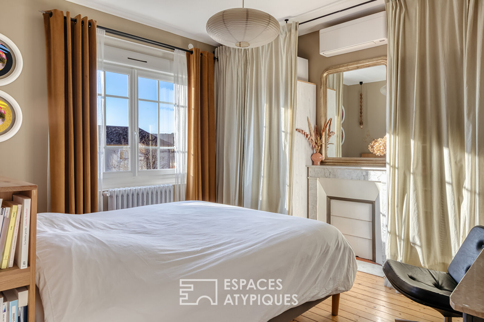 On the first floor, the charm truly shines: the generously sized bedrooms retain their moldings and marble fireplaces, while the bathroom stands out as a room in its own right, with its freestanding clawfoot bathtub, walk-in shower, and a toilet that blends period charm with modern comfort.