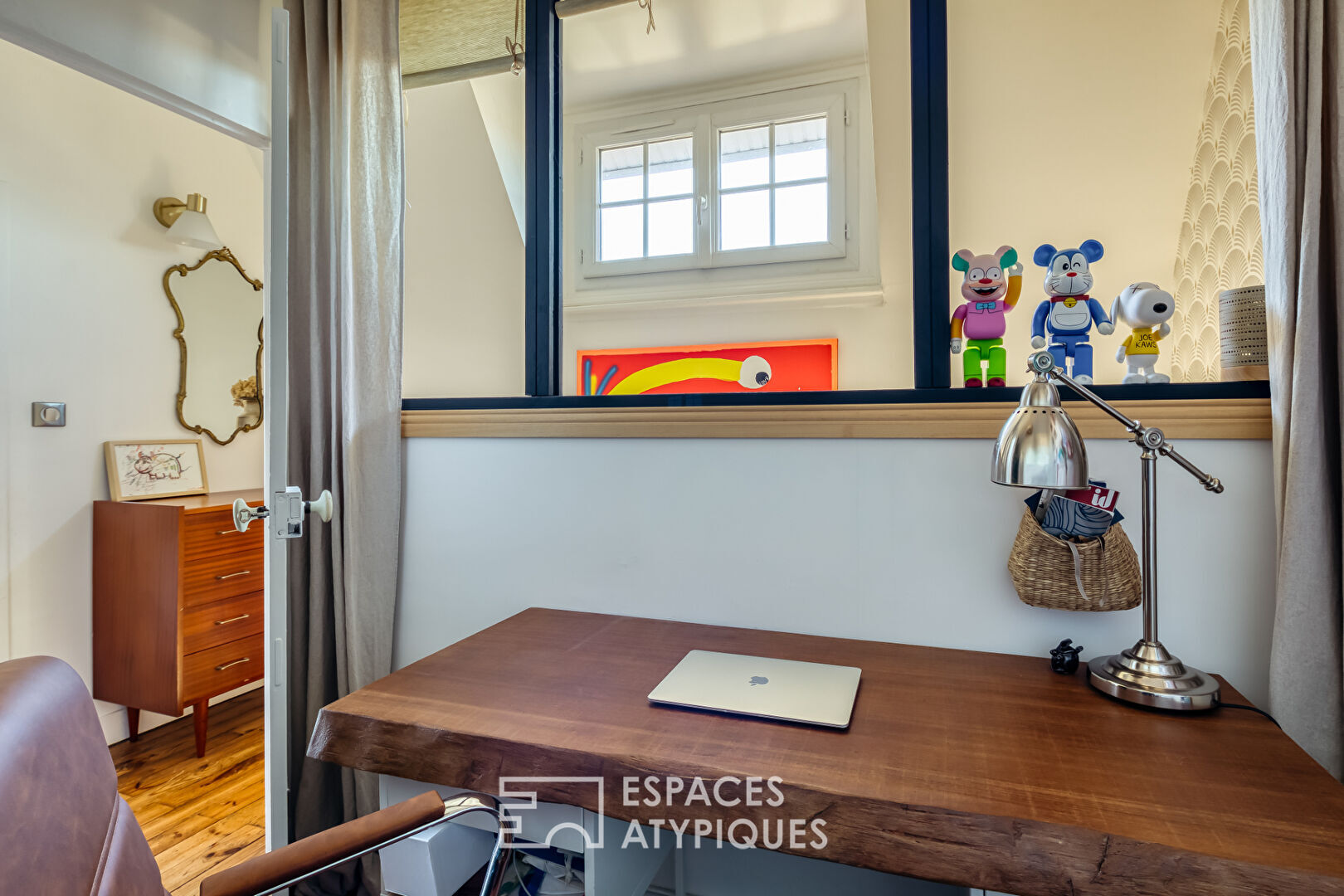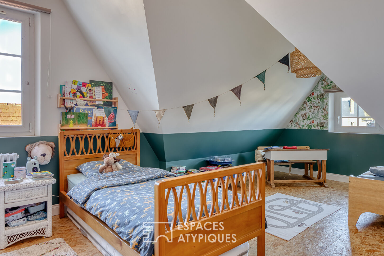 The top floor features an office with a skylight that floods the space with natural light, ideal for working from home, as well as a large bedroom with a cathedral ceiling, perfect for children or as a master suite.