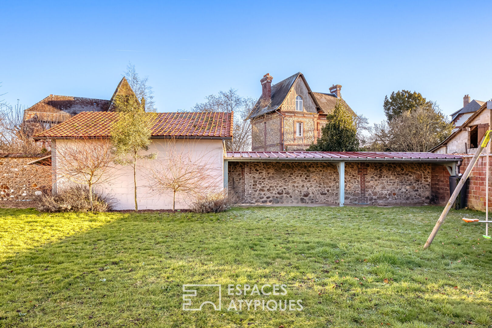 Behind its gate, a gravel driveway provides parking for several vehicles, along with a garage. The enclosed garden features a beautiful cumaru wood deck, a natural invitation to enjoy long summer days. A functional carport extends the outdoor space and is suitable for both children’s play and storage needs.