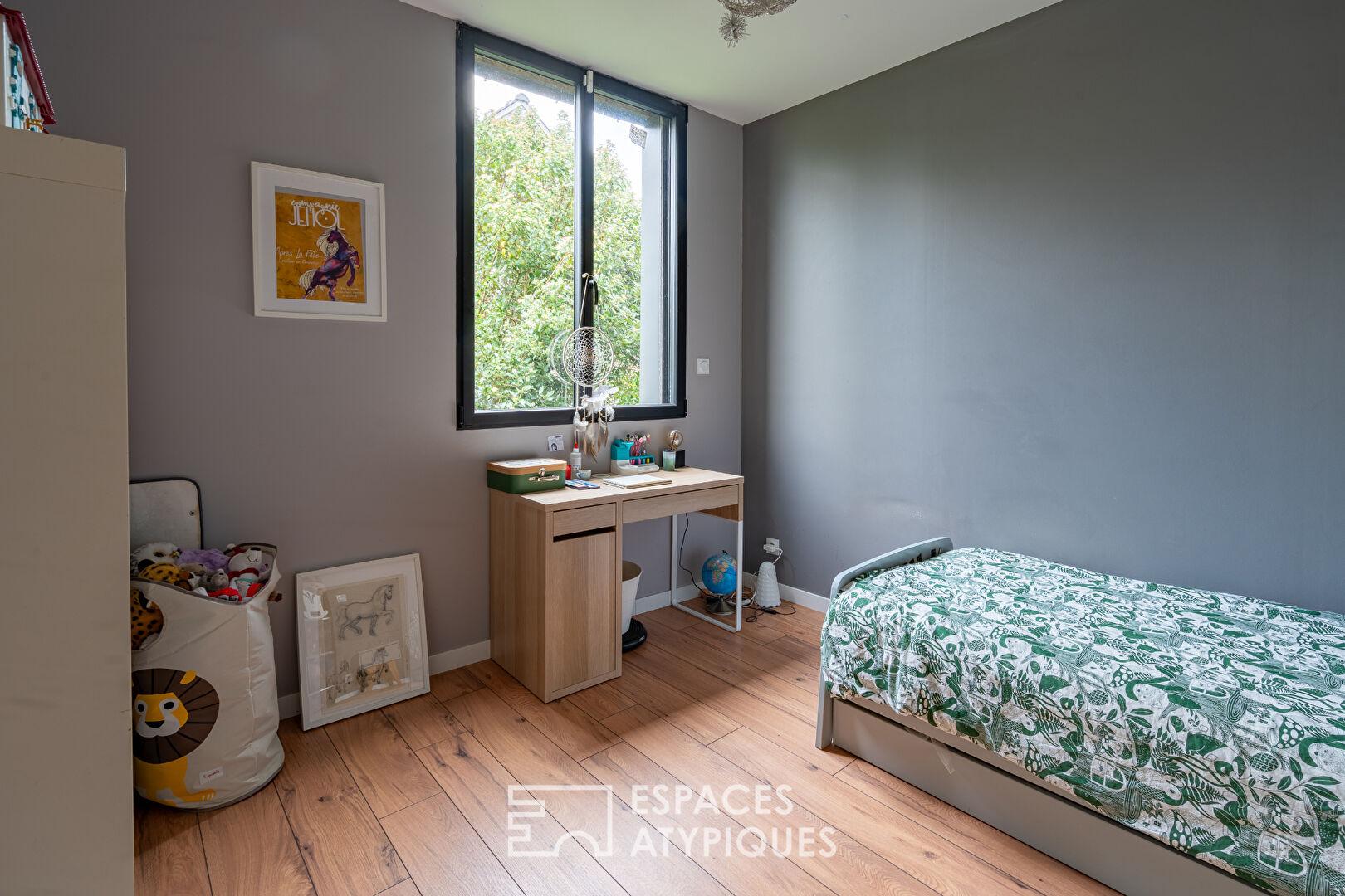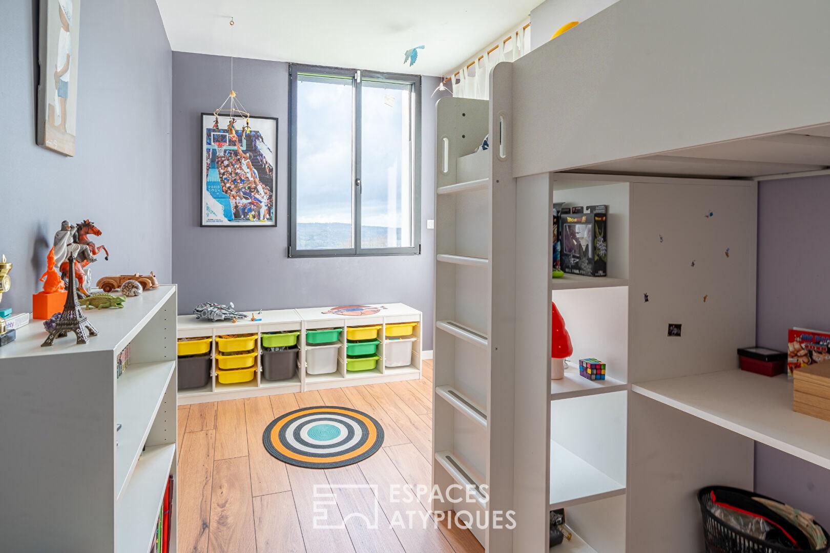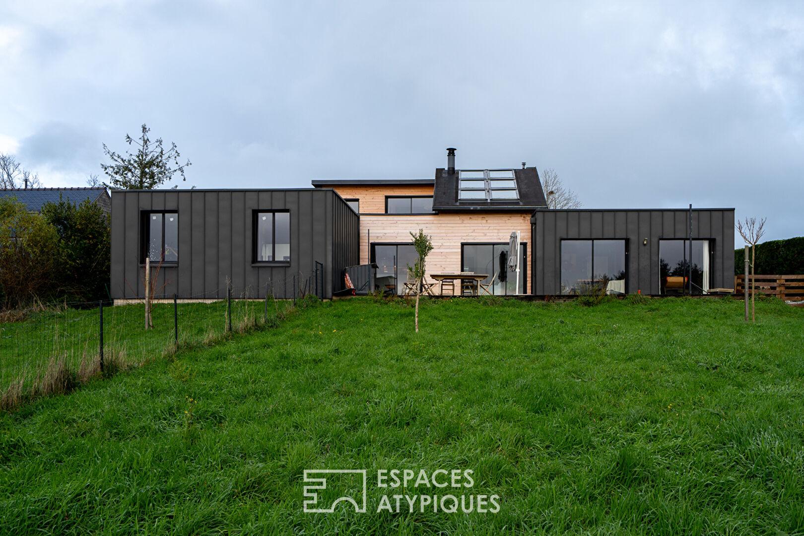 Nestled in a remarkable natural setting in Rosnoën, this contemporary architect-designed house offers approximately 220 sq m of living space on a landscaped plot of around 3,000 sq m. Its commanding position provides unobstructed panoramic views of the valley, the surrounding plains, and the Aulne River, whose presence graces the landscape all the way to the viewpoint. Built with a timber frame and enhanced by a contemporary extension, this property skillfully blends prestige and unique character, characterized by a restrained yet elegant architecture that combines wood cladding, zinc, and horizontal volumes. The exterior spaces are arranged around several wooden terraces, an intimate patio, and a vast garden that opens onto a natural landscape that changes with the seasons, offering complete privacy and a peaceful, secluded atmosphere. The ground floor features generous, light-filled living areas, centered around a living room with spectacular proportions. The open-plan kitchen, both functional and inviting, flows seamlessly into the dining and living rooms, which open onto the outdoors through large bay windows framing the verdant panorama and the water’s edge below. The chosen materials–polished concrete, wood, and industrial-style glass partitions–underscore the contemporary architectural identity of the space. This level also offers a ground-floor bedroom and a dedicated children’s area with several bedrooms and a bathroom. The patio, accessible from the living room and one bedroom, provides a sheltered outdoor space, a true extension of the house, perfect for relaxing in privacy. Upstairs, a bright and versatile open mezzanine leads to an independent master suite, comprising a bedroom, a dressing room, a shower room, and direct access to a panoramic terrace, offering a privileged view of the landscape, encompassing sky, nature, and the water. The outdoor spaces fully extend the indoor experience. Wooden terraces complement the different times of day, while the gently sloping garden opens onto a tranquil natural setting. Nearby walking paths invite exploration of the surrounding area, and the river, easily accessible from the house, allows for water sports such as kayaking and paddleboarding, reinforcing an outdoor lifestyle. The setting is peaceful, green, and residential, yet close to essential shops, just a few minutes’ walk away. Unique in its architectural style, its expansive views, its immersion in nature, and the quality of its proportions, this distinctive house embodies a contemporary approach to living, designed for a sustainable and inspiring quality of life. A rare property, ideal as a primary or secondary residence, where every space has been designed to create a seamless harmony between the interior, the horizon, and the surrounding nature. Energy rating: B / Climate rating: A. Estimated annual energy costs for standard use: between EUR1,540 and EUR2,150 per year. Average energy prices indexed as of January 1, 2021 (including subscriptions). Information on the risks to which this property is exposed is available on the Géorisques website: https://www.georisques.gouv.fr. Contact: Laurent 33 6 62 33 89 91. RSAC: 852199579 BREST. Agency fees: 5% including VAT, payable by the seller for properties over EUR200,000. Flat fee of EUR10,000 including VAT, payable by the seller for properties under EUR200,000.