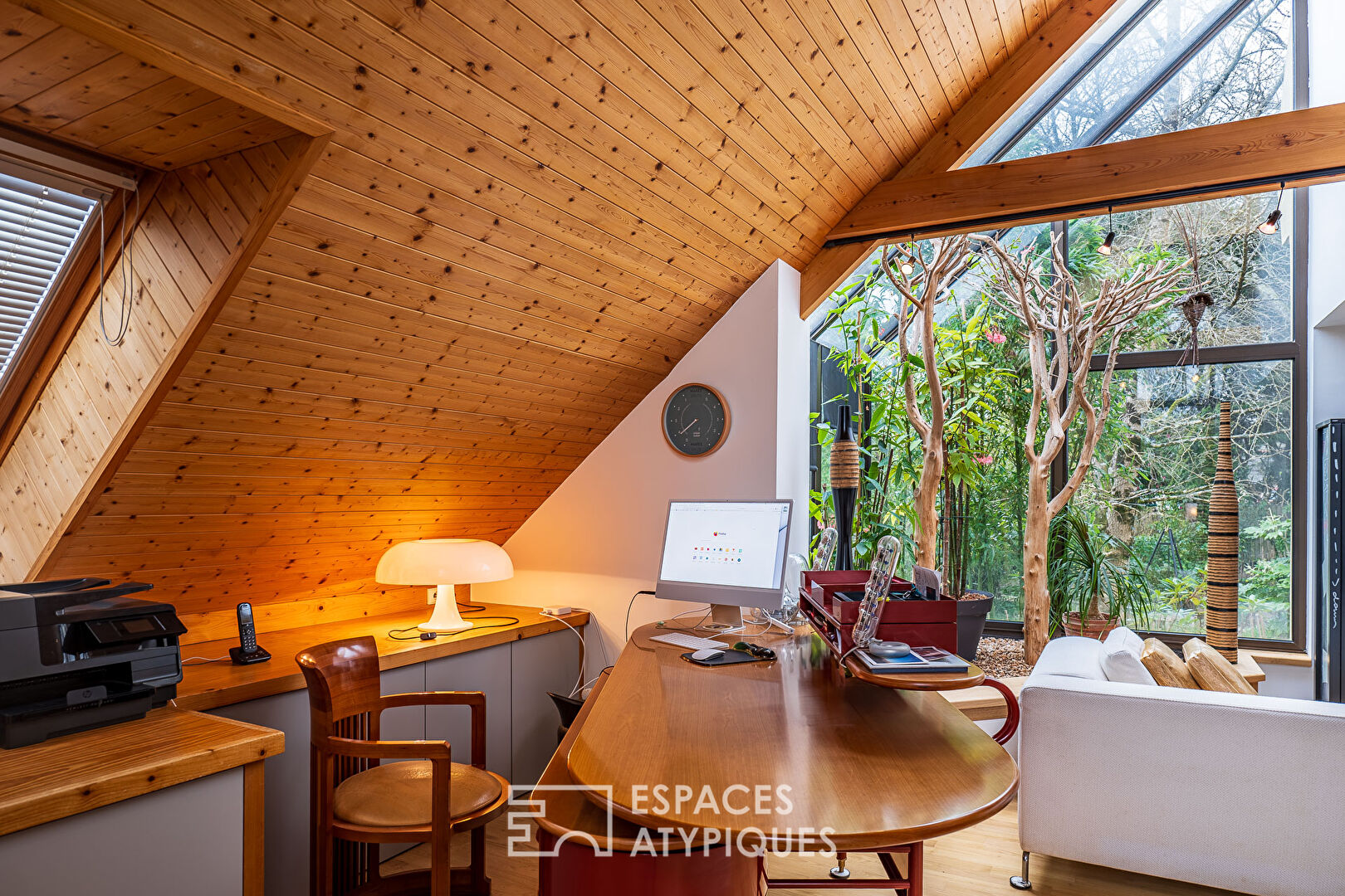 The sleeping area continues to the top floor via a comfortable staircase offering three generous bedrooms, which share a bathroom as well as a dressing room. Access to the garden is available in several ways, including an elegant split level which leads to a charming veranda designed as a winter garden. This glazed extension offers a smooth transition between inside and outside, allowing you to admire the view of the garden without forgetting its ideally exposed terrace.