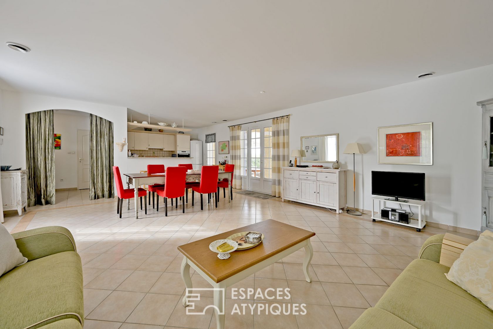 This quality villa is located in Nages et Solorgues, one of the most charming villages of Vaunage, a privileged area near Nîmes. The house, designed by an architect in the southern style, offers 180 m2 of living space on one level on a nicely wooded plot of over 1,280 m2. The layout of the house very current and well thought out, presents a beautiful living room of almost 50 m2 with open kitchen. This space opens onto a large partially covered terrace allowing you to fully enjoy the beautiful sunny days by the pretty swimming pool. A magnificent view over the plain and the surrounding villages adds to the tranquility of the place. The sleeping areas are divided into an astonishing parental suite of approximately 35 m2 with shower room, loggia and sauna as well as two other bedrooms and a bathroom. The villa also offers “the workshop”, a beautiful additional room of 13 m2 very bright with multiple uses: office, reading corner, drawing studio, bedroom etc…. as well as a shed and a laundry room of 24 m2 extremely practical and functional on a daily basis. This very functional and very well equipped villa, located in a quiet area and close to all amenities, is a great opportunity in this sought after area. Contact: Claudine 06.22.17.01.66