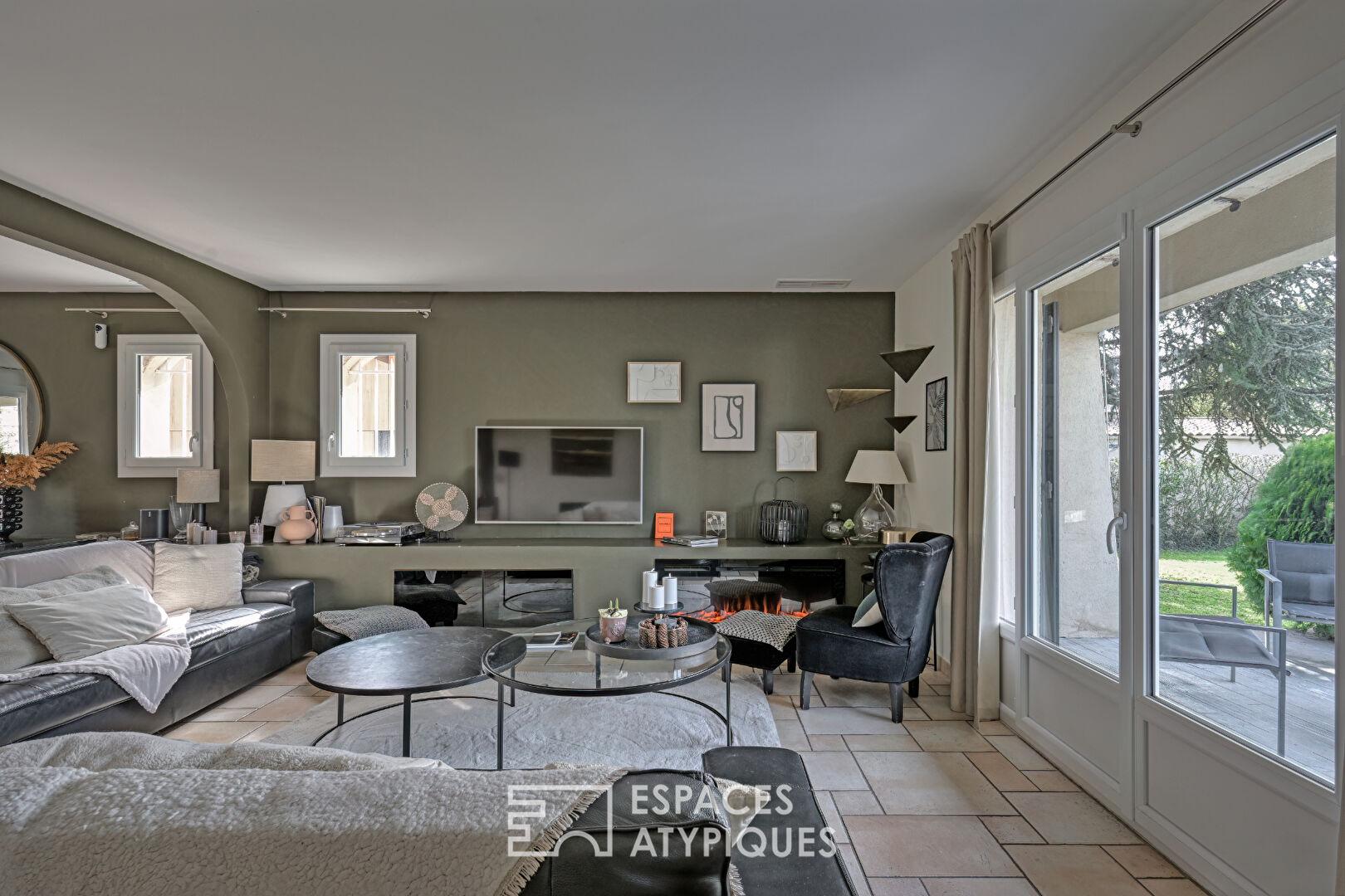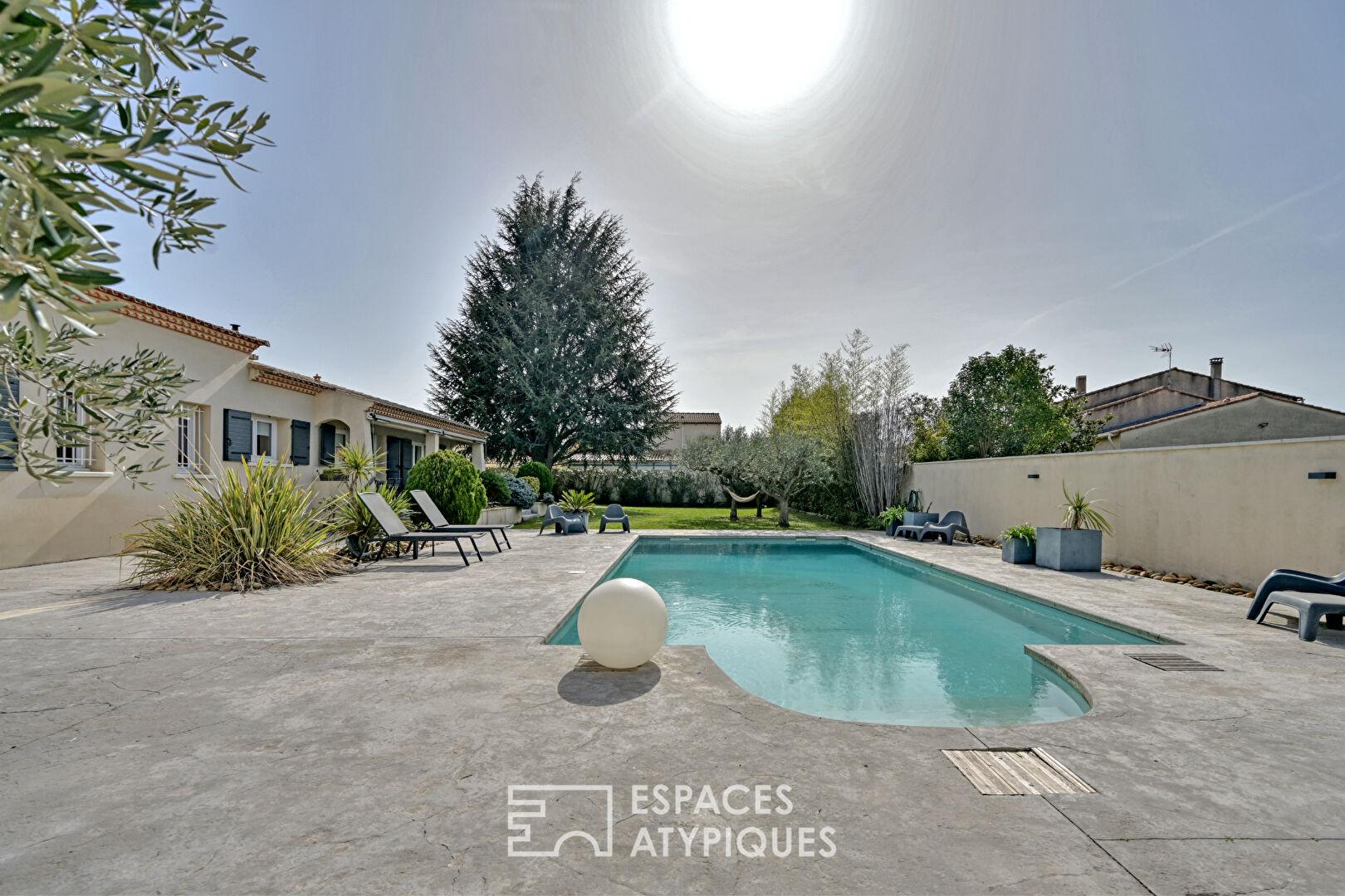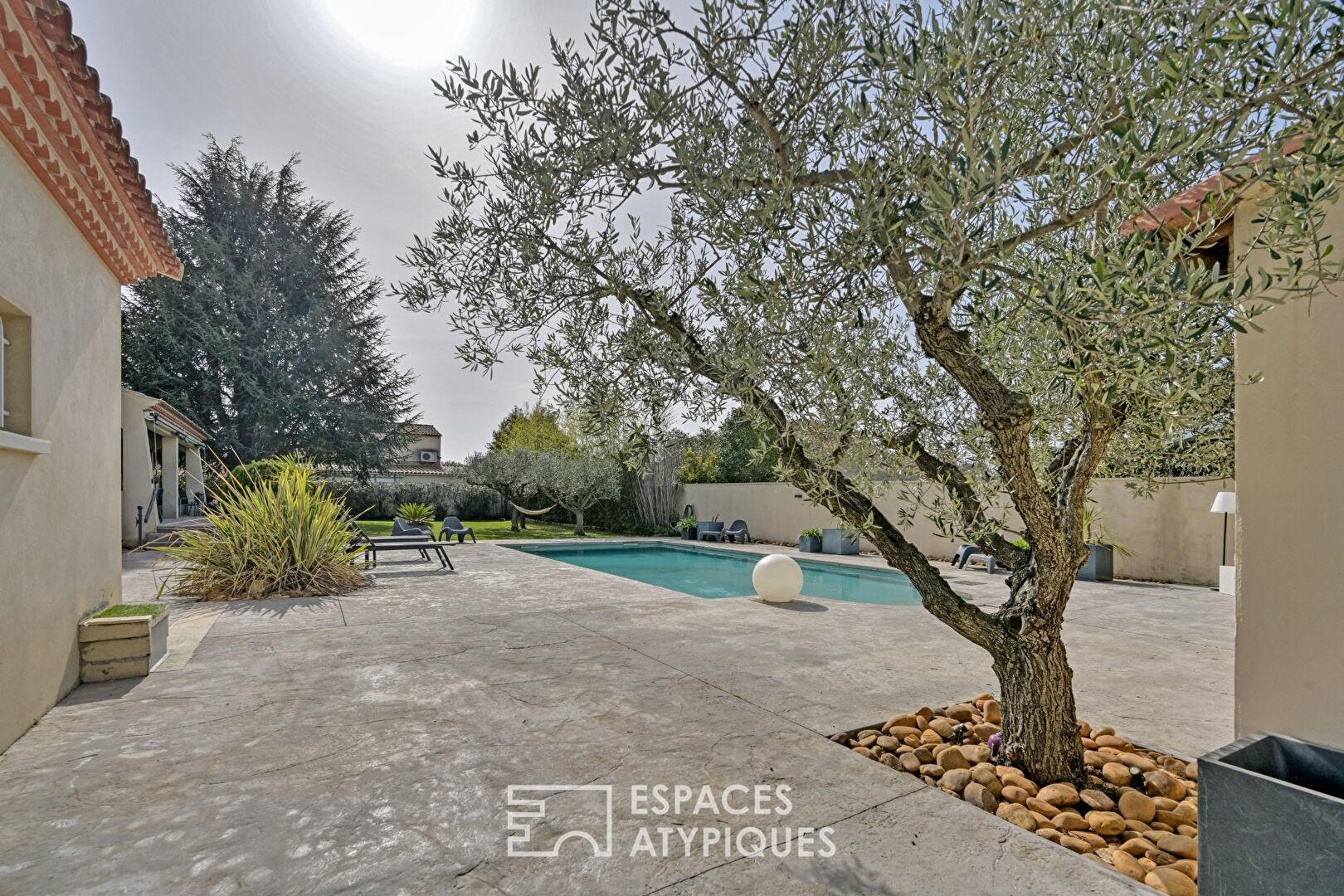 Exclusively listed, in a quiet residential area of the sought-after village of Caissargues, sheltered by a magnificent century-old cedar tree, discover this fully renovated 1980s house, bathed in natural light and offering a bright, airy feel.