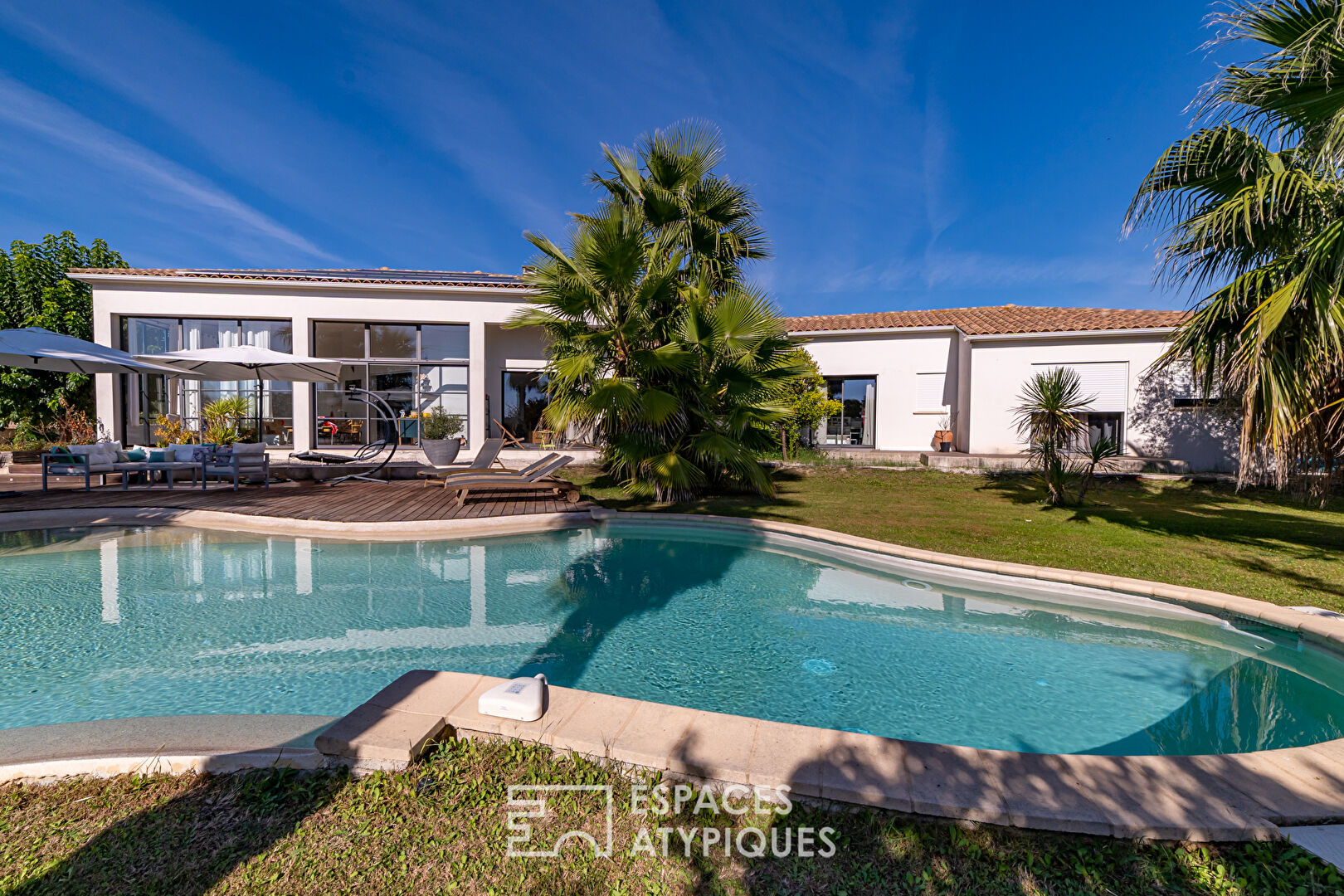 Flooded with light, this recent contemporary villa has 285 m2 on one level organized around a magnificent garden with trees.