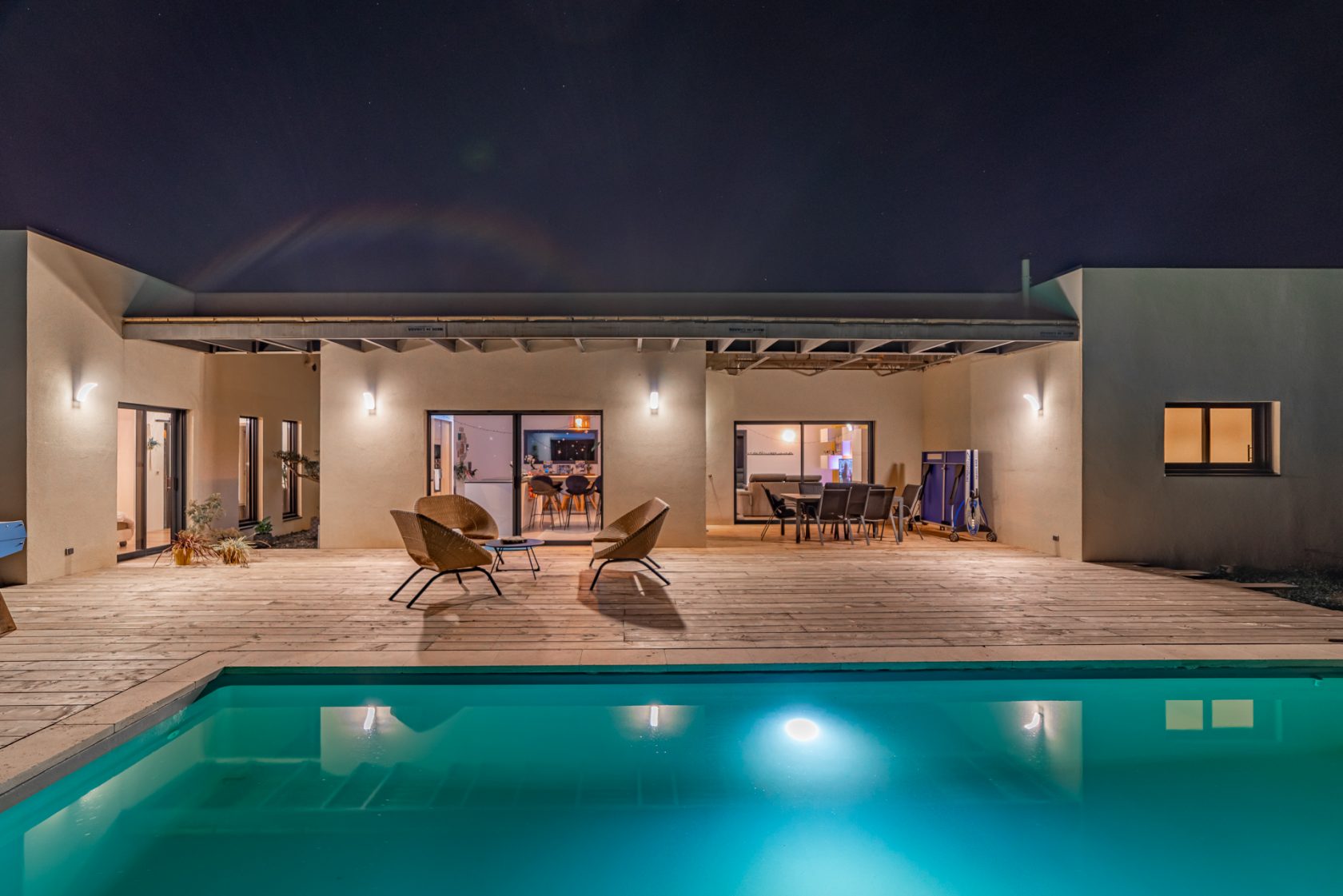 Here is the rare opportunity of a splendid recent villa located in an environment of absolute calm a few minutes from Sommières. With a very refined graphic style, the house is located on a plot of over 1,600 m2. It offers 200 m2 on one level cleverly organized around a comfortable living room of 70 m2 widely open to the outside. Large bay windows, some with brick partition, offer multiple accesses to the vast terrace dressed in Douglas-fir, to the swimming pool and to the garden. A high-quality kitchen with central island and integrated table brings a certain conviviality that is very appreciable in everyday life. On either side of the central room are the night rooms. On the one hand a parental suite of 30m2 opening onto the garden with dressing room and private bathroom, on the other hand an independent space offering 4 other bedrooms and two bathrooms. Some exterior finishes, in particular the landscaping of the garden remain to be expected. It is also possible to perfect the habitability by creating a pool house of about 40 m2. A large courtyard to accommodate a few cars, a technical room, a garage of 27 m2 with window and a large cellar still effectively complete the property. Here is a high quality property, benefiting from the most recent technologies and offering a warm living environment in this sought-after area.