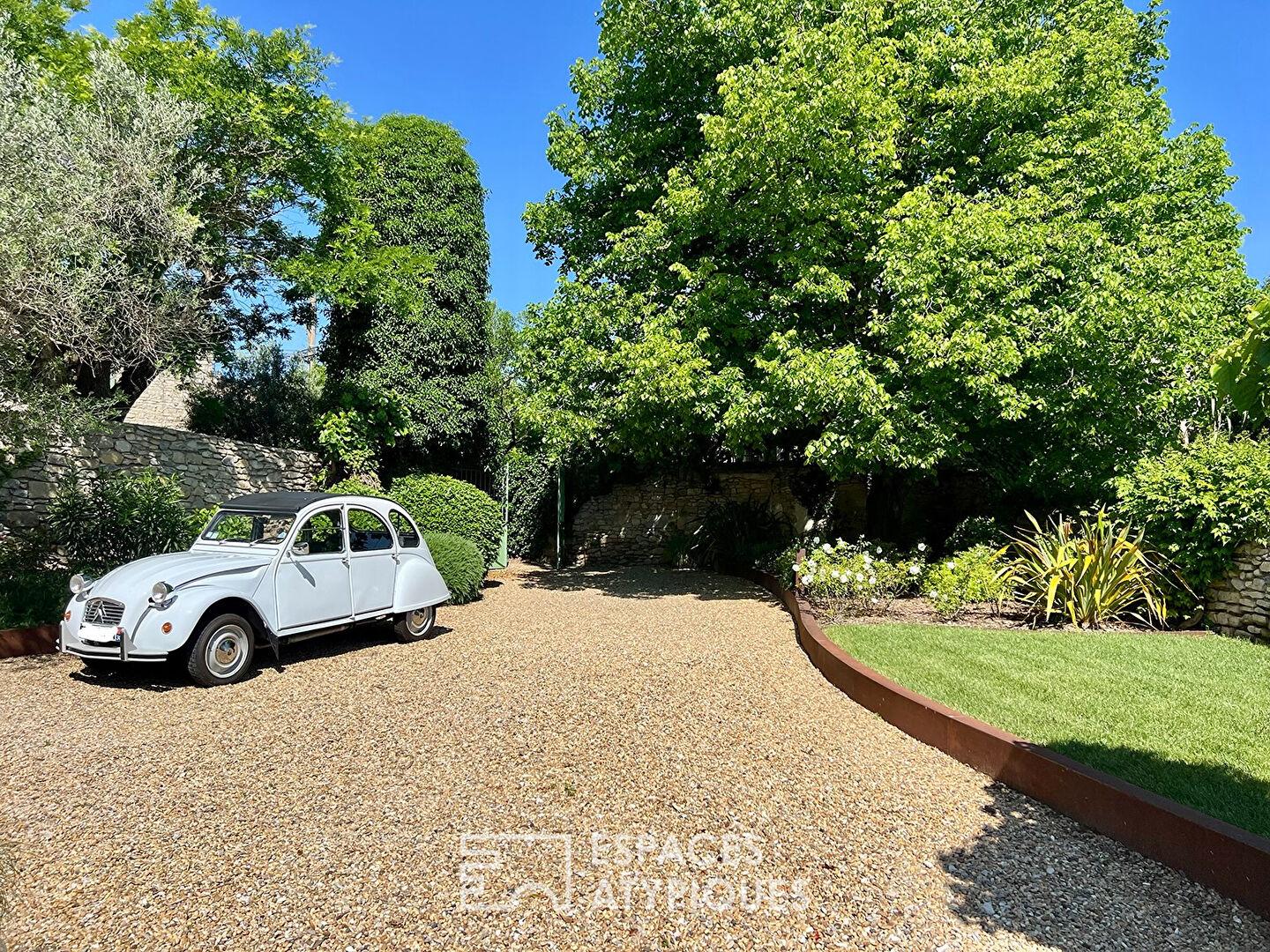 The property is accessed through a charming private courtyard, lined with Mediterranean flora, offering an unobstructed panoramic view of the Vaunage hills.