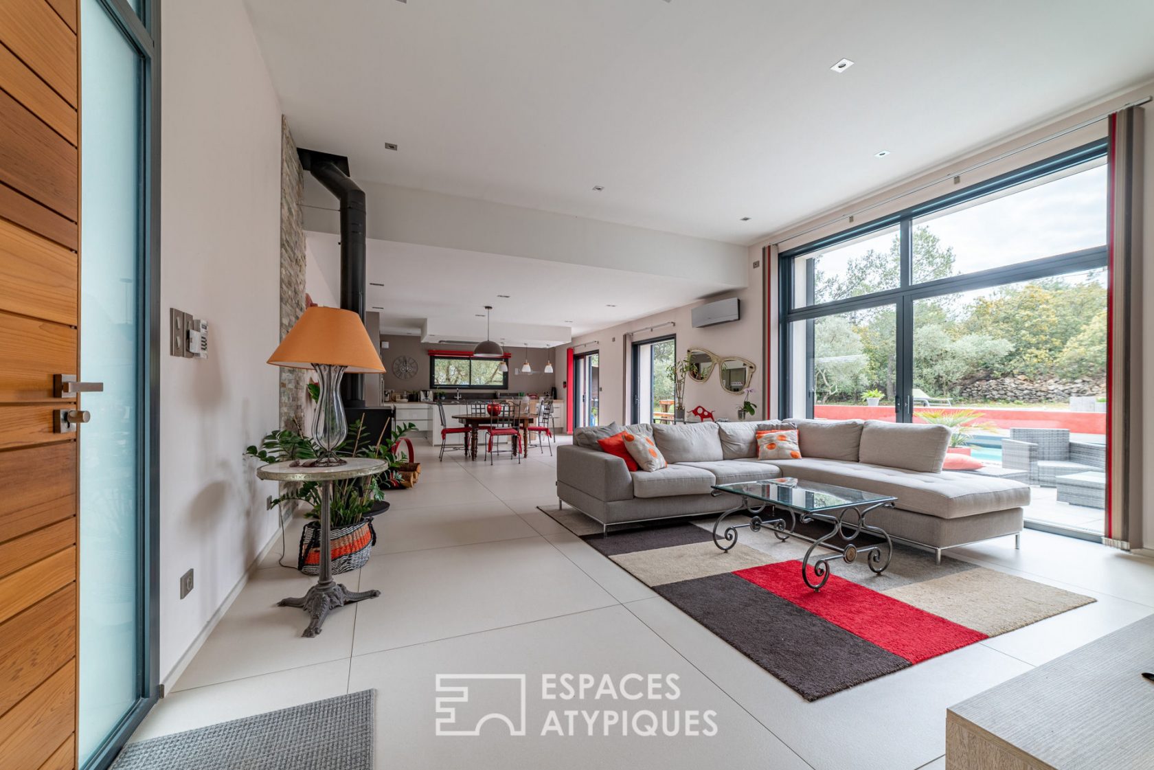 This magnificent contemporary single storey villa of 160m2 with 40m2 garage is set on a beautiful plot with swimming pool on the western hills of Nîmes, near the Vacquerolles golf course and 15 minutes from the city center. Very bright thanks to its large bay windows, the fully air-conditioned villa has high-end services. The large living room of 75m2 includes a living room with wood stove, a dining area, a fully equipped kitchen and opens onto the terrace and its 3x9m swimming pool secured by a pool deck. The night area consists of a master bedroom with shower room giving access to the terrace, 2 other bedrooms, a bathroom and an office. A large garage of 40m2 modifiable in living space also completes this property.