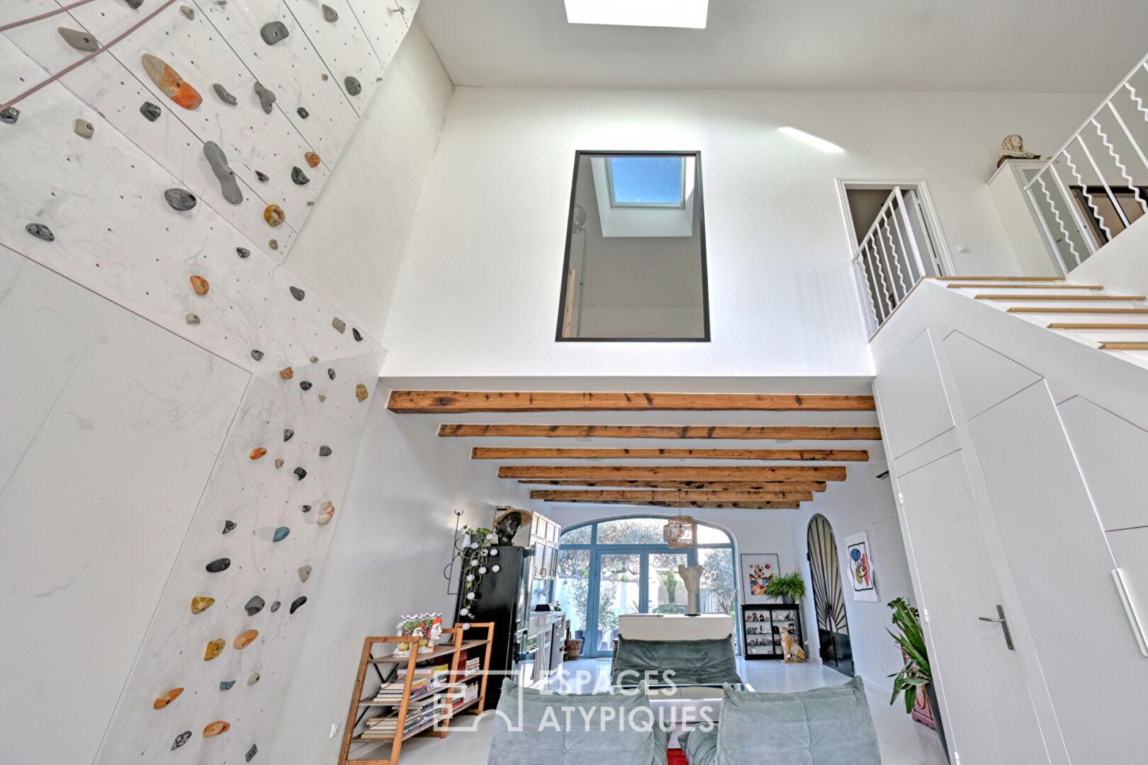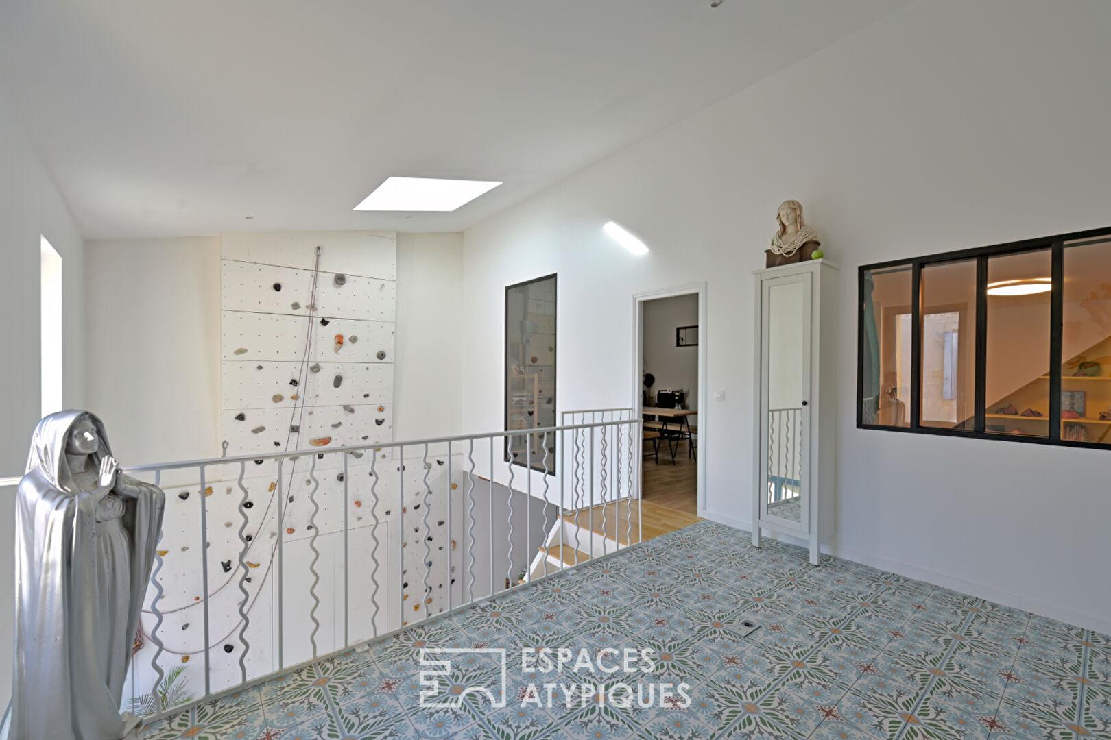 Upon entering, a magnificent 6.4-meter-high atrium houses a private climbing wall, bathed in the zenithal light of a skylight. The ground floor, fully equipped with a multi-room sound system, reveals a vast, unified living space where the living room and kitchen share the area, opening onto the terrace and garden through an arched bay window.