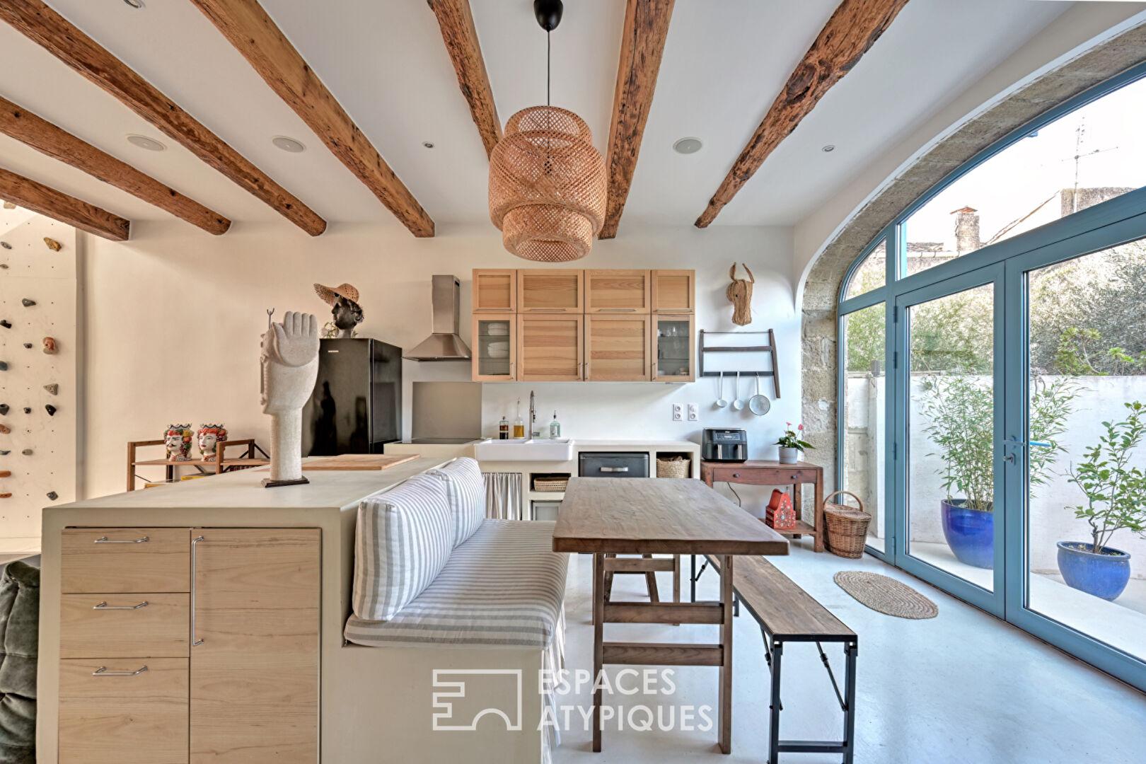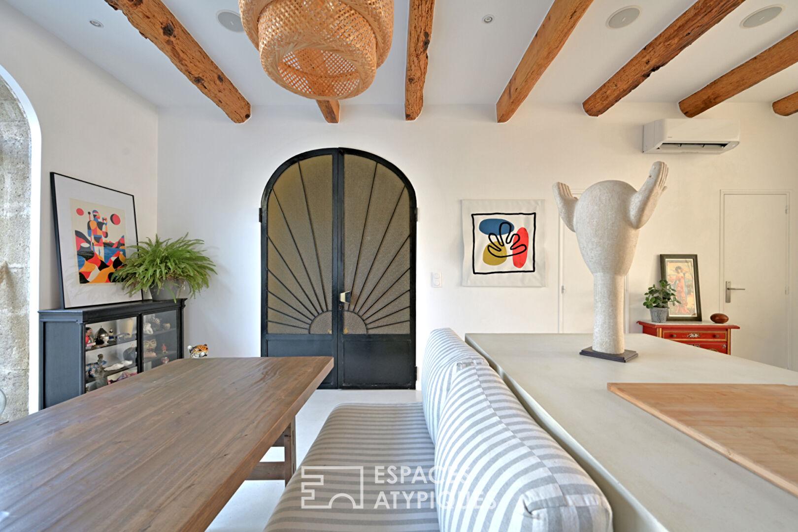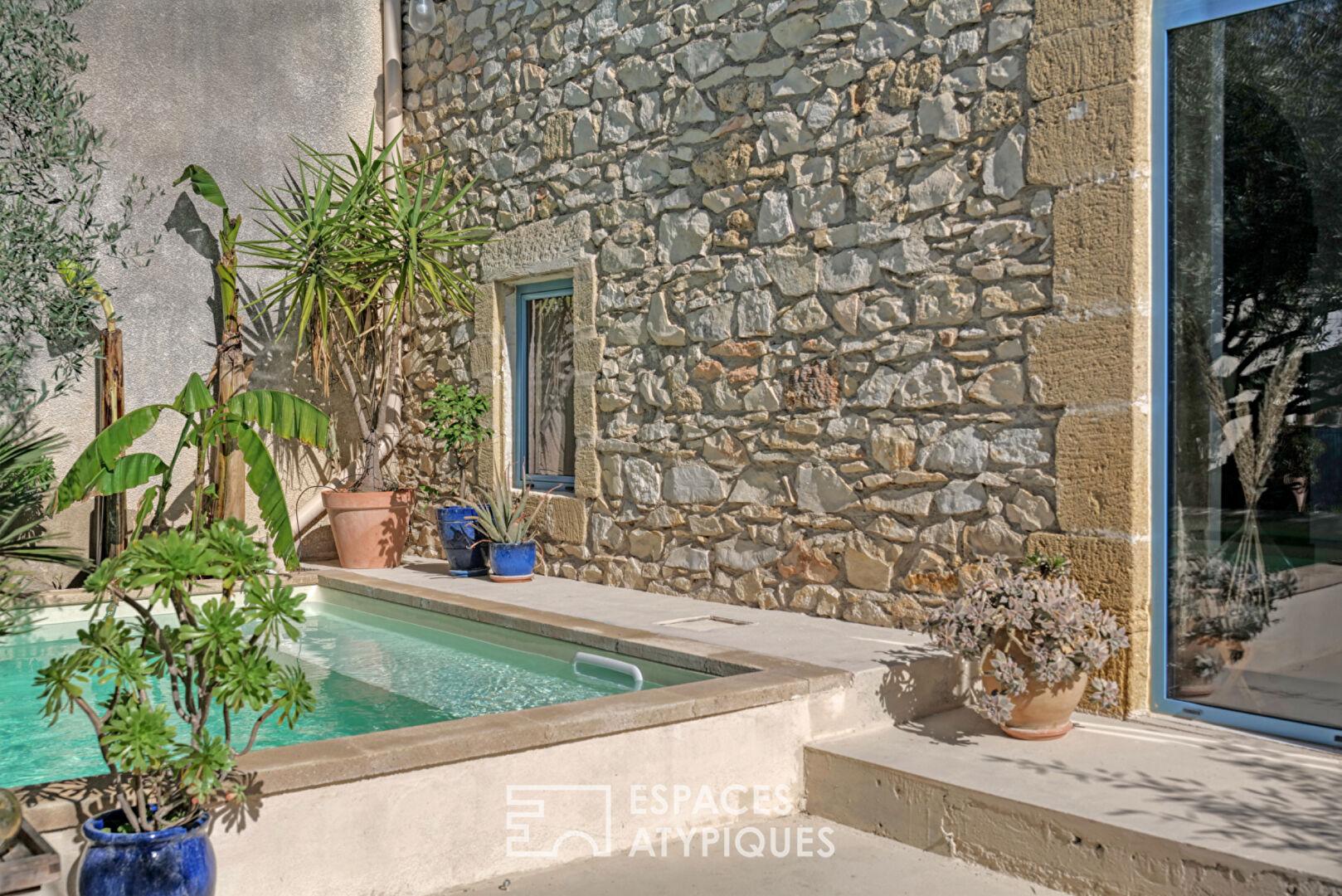 Between Nîmes and the beaches of Grau-du-Roi, this unique property blends the authenticity of exposed stone with a bold contemporary style.
