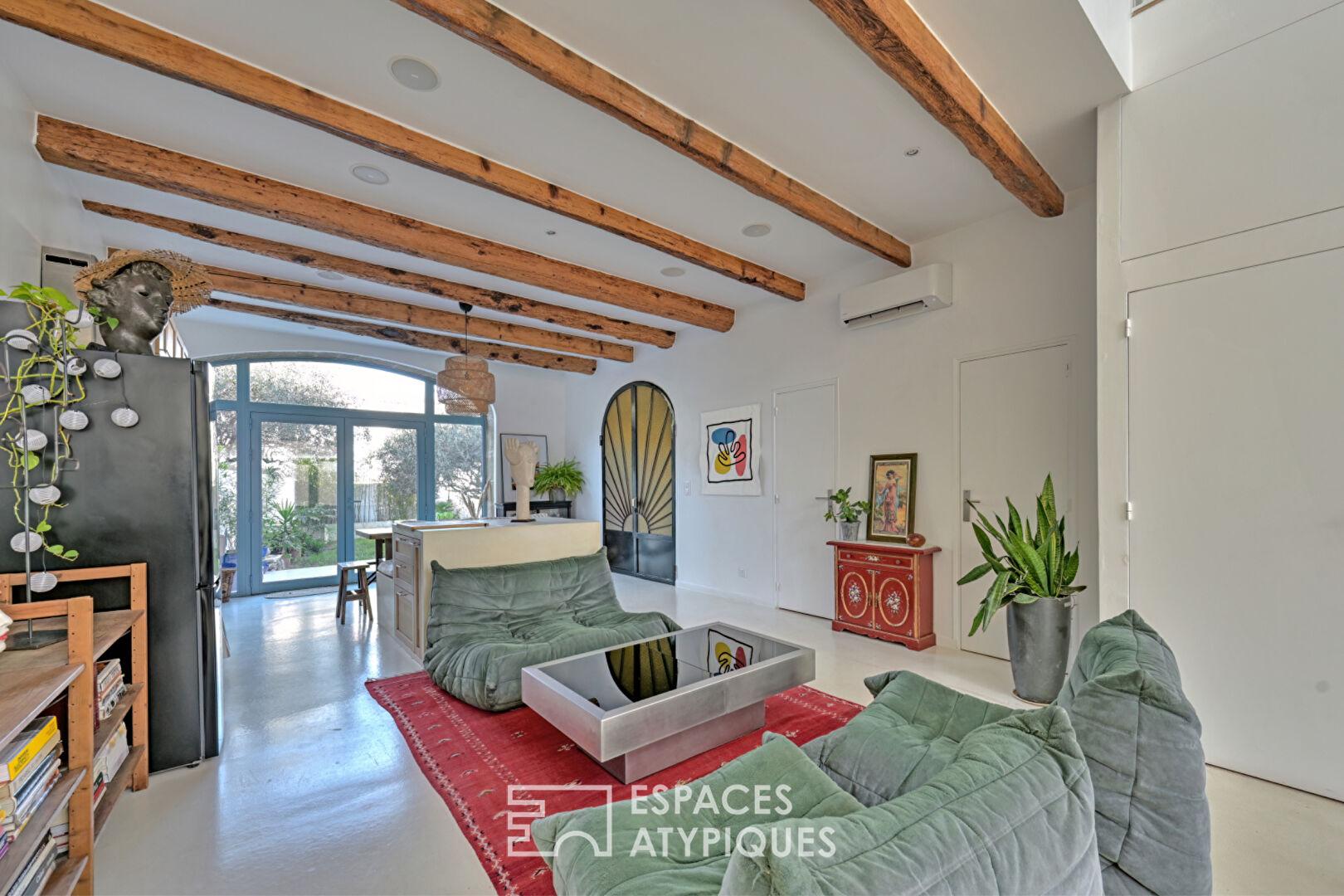 In the heart of the village of Codognan, this village house, renovated by an interior designer and an artist duo, unfolds 166 square meters of raw poetry.